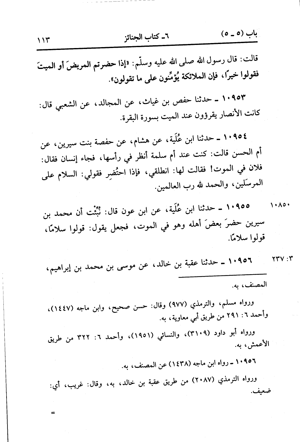 10954- حَدَّثَنَا ابْنُ عُلَيَّةَ ، عَنْ هِشَامٍ ، عَنْ حَفْصَةَ بِنْتِ سِيرِينَ ، عَنْ أُمِّ الْحَسَنِ قَالَتْ : كُنْت عِنْدَ أُمِّ سَلَمَةَ أَنْظُرُ فِي رَأْسِهَا , فَجَاءَ إنْسَانٌ فَقَالَ : فُلاَنٌ فِي الْمَوْتِ ، فَقَالَتْ لَهَا انْطَلِقِي , فَإِذَا احْتُضِرَ فَقَوْلِي : السَّلاَمُ عَلَى الْمُرْسَلِينَ , وَالْحَمْدُ لِلَّهِ رَبِّ الْعَالَمِينَ.