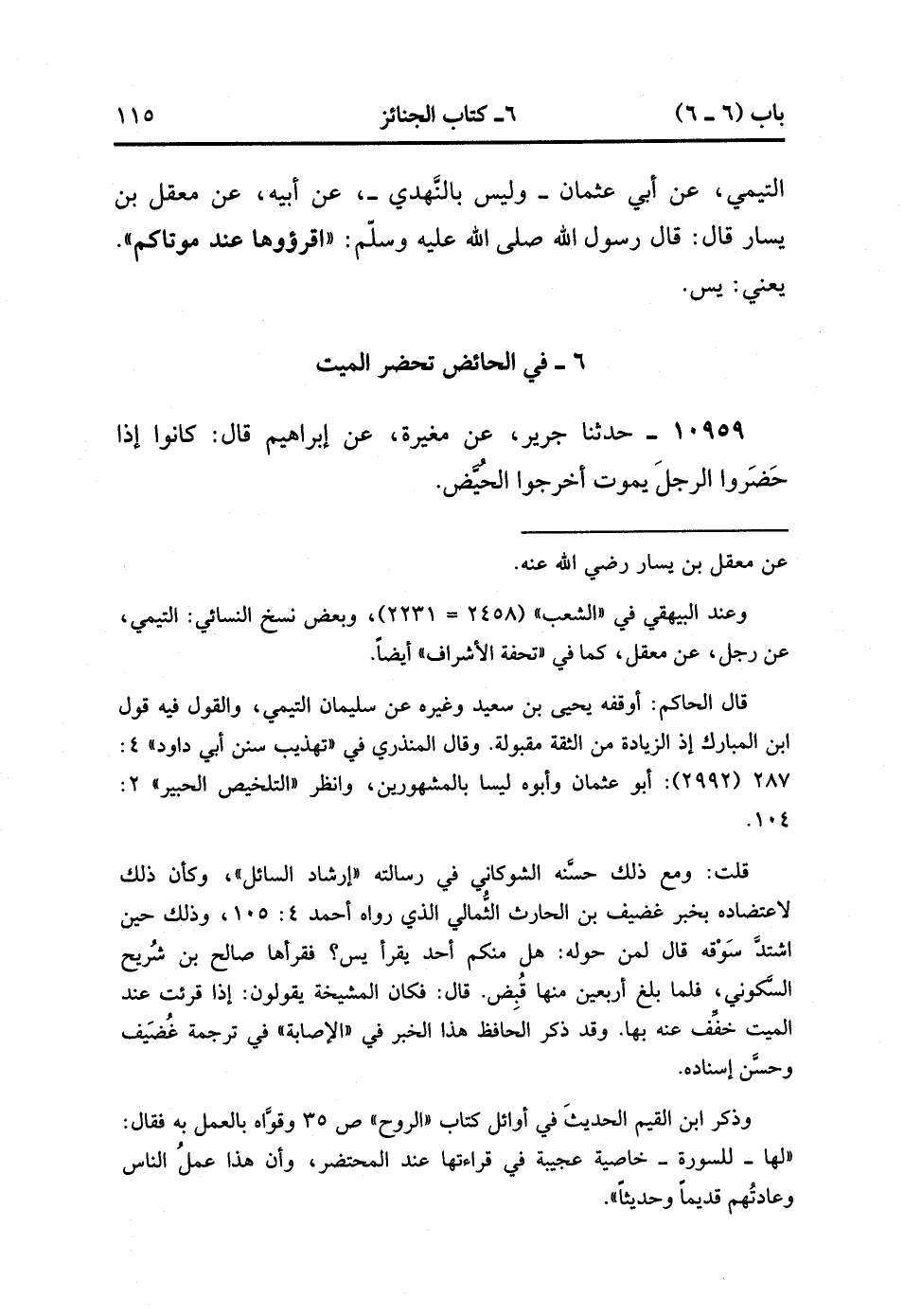 10959- حَدَّثَنَا جَرِيرٌ ، عَنْ مُغِيرَةَ ، عَنْ إبْرَاهِيمَ ، قَالَ : كَانُوا إذَا حَضَرُوا الرَّجُلَ يَمُوتُ أَخْرَجُوا الْحُيَّضَ. (3/237).