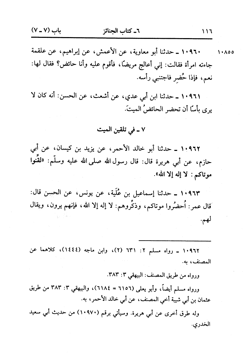10963- حَدَّثَنَا إسْمَاعِيلُ ابْنُ عُلَيَّةَ ، عَنْ يُونُسَ ، عَنِ الْحَسَنِ ، قَالَ عُمَرُ احْضُرُوا مَوْتَاكُمْ وَذَكِّرُوهُمْ لاَ إلَهَ إِلاَّ اللَّهُ ، فَإِنَّهُمَا يَرَوْنَ وَيُقَالُ لَهُمْ. (3/237).