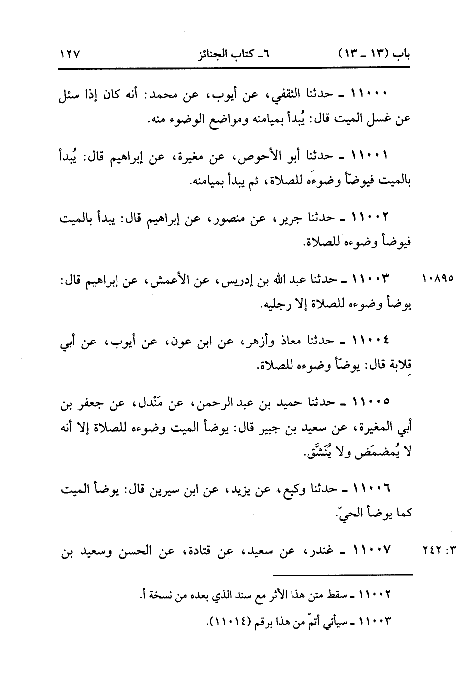 11007- غُنْدَرٌ ، عَنْ سَعِيدٍ ، عَنْ قَتَادَةَ ، عَنِ الْحَسَنِ ، وَسَعِيدِ بْنِ الْمُسَيَّبِ أَنَّهُمَا قَالاَ : فِي الْمَيِّتِ يُوَضَّأُ وُضُوءَهُ لِلصَّلاَةِ. (3/241).