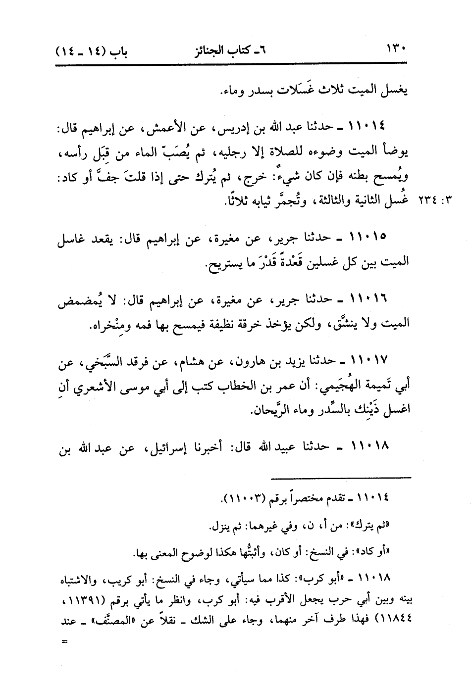 11014- حَدَّثَنَا عَبْدُ اللهِ بْنُ إدْرِيسَ ، عَنِ الأَعْمَشِ ، عَنْ إبْرَاهِيمَ ، قَالَ : يُوَضَّأُ الْمَيِّتُ وُضُوءَهُ لِلصَّلاَةِ إِلاَّ رِجْلَيْهِ ، ثُمَّ يُصَبُّ الْمَاءُ مِنْ قِبَلِ رَأْسِهِ وَيُمْسَحُ بَطْنُهُ ، فَإِنْ كَانَ شَيْءٌ خَرَجَ ، ثُمَّ يُتْرَكُ ، حَتَّى إذَا قُلْتَ جَفَّ ، أَوْ كَادَ ، غُسِلَ الثَّانِيَةَ وَالثَّالِثَةَ ، وَتُجَمَّرُ ثِيَابُهُ ثَلاَثًا. (3/242)