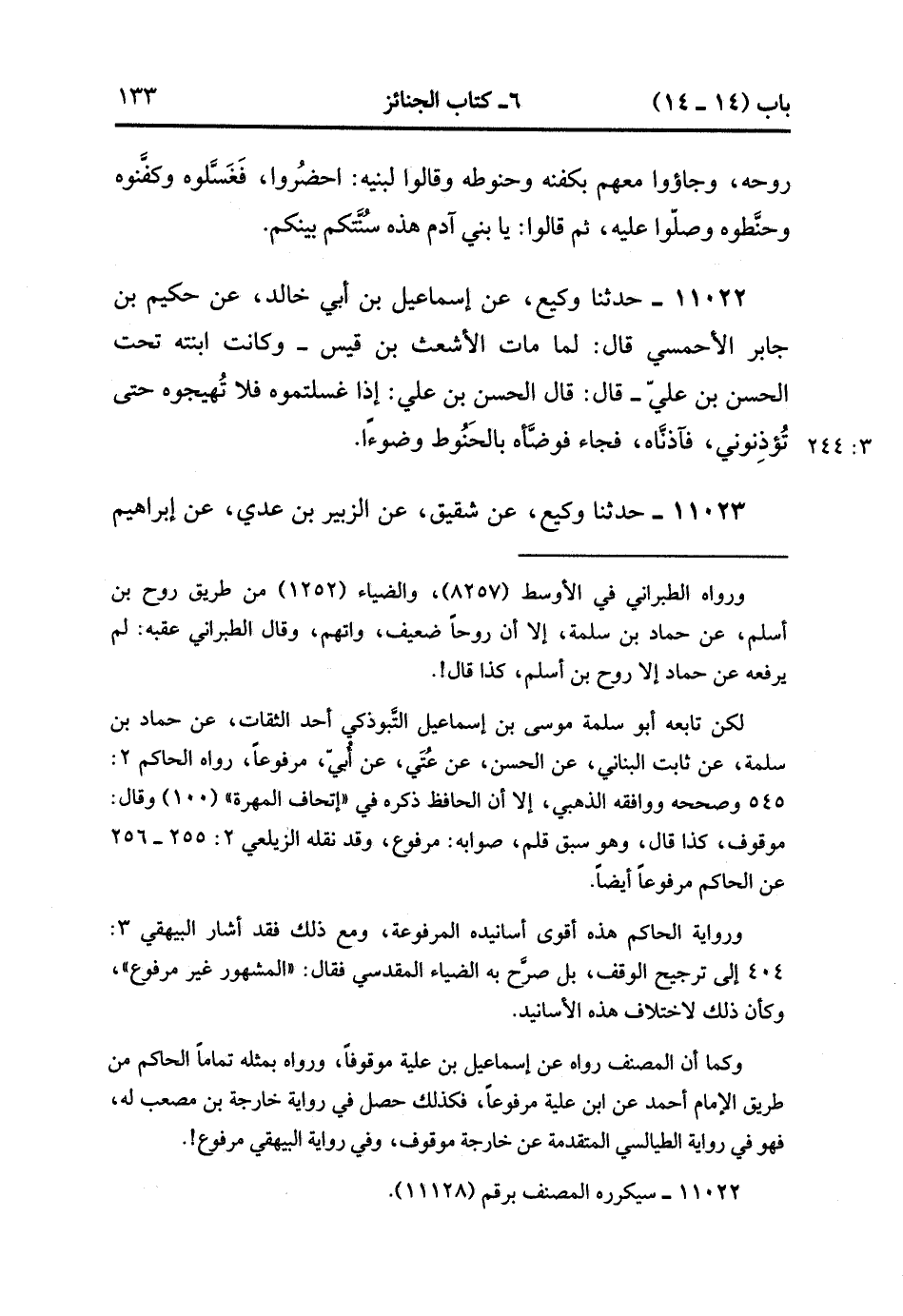 11022- حَدَّثَنَا وَكِيعٌ ، عَنْ إسْمَاعِيلَ بْنِ أَبِي خَالِدٍ ، عَنْ حَكِيمِ بْنِ جَابِرٍ الأَحْمَسِيِّ ، قَالَ : لَمَّا مَاتَ الأَشْعَثُ بْنُ قَيْسٍ وَكَانَتِ ابْنَتُهُ تَحْتَ الْحَسَنِ بْنِ عَلِيٍّ ، قَالَ : قَالَ الْحَسَنِ بْنِ عَلِيٍّ إذَا غَسَّلْتُمُوهُ فَلاَ تُهَيجوهُ حَتَّى تُؤْذِنُونِي فَآذَنَّاهُ فَجَاءَ فَوَضَّأَهُ بِالْحَنُوطِ وُضُوءًا. (3/243)