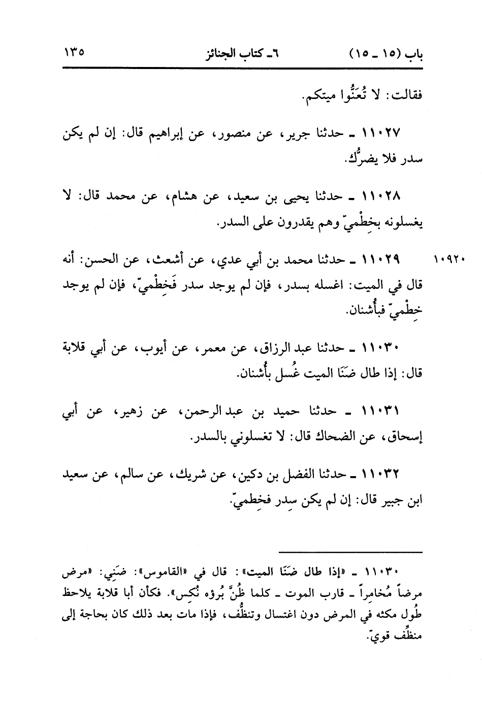 11032- حَدَّثَنَا الْفَضْلُ بْنُ دُكَيْنٍ ، عَنْ شَرِيكٍ ، عَنْ سَالِمٍ ، عَنْ سَعِيدِ بْنِ جُبَيْرٍ ، قَالَ : إذَا لَمْ يَكُنْ سِدْرٌ فَخَطْمِيٌّ. (3/244).