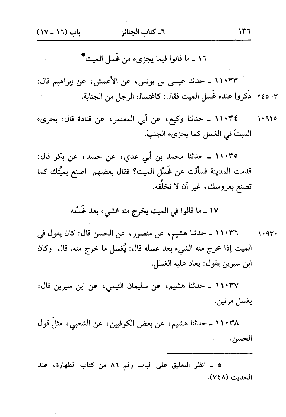 11038- حَدَّثَنَا هُشَيْمٌ ، عَنْ بَعْضِ الْكُوَفِيينَ ، عَنِ الشَّعْبِيِّ مِثْلَ قَوْلِ الْحَسَنِ. (3/245).