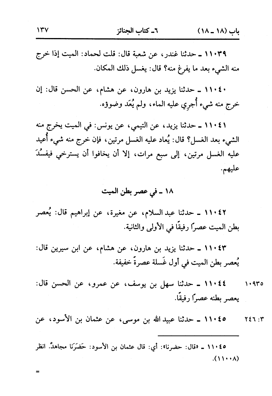 11039- حَدَّثَنَا غُنْدَرٌ ، عَنْ شُعْبَةَ ، قَالَ : قُلْتُ لِحَمَّادٍ الْمَيِّتُ إذَا خَرَجَ مِنْهُ الشَّيءُ بَعْدَ مَا يُفْرَغُ مِنْهُ ، قَالَ يُغْسَلُ ذَلِكَ الْمَكَانُ.