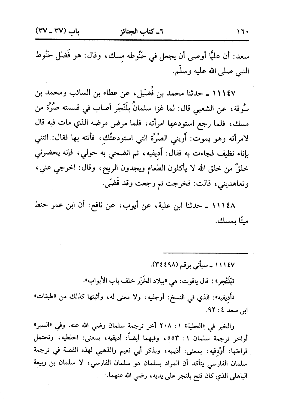 11147- حَدَّثَنَا مُحَمَّدُ بْنُ فُضَيْلٍ ، عَنْ عَطَاءِ بْنِ السَّائِبِ وَمُحَمَّدُ بْنُ سُوقَةَ ، عَنِ الشَّعْبِيِّ ، قَالَ لَمَّا غَزَا سَلْمَانُ بَلَنْجَرَ ، أَصَابَ فِي قِسْمَتِهِ صُرَّةً مِنْ مِسْكٍ ، فَلَمَّا رَجَعَ اسْتَوْدَعَهَا امْرَأَتَهُ ، فَلَمَّا مَرِضَ مَرَضَهُ الَّذِي مَاتَ فِيهِ ، قَالَ لاِمْرَأَتِهِ وَهُوَ يَمُوتُ : أَرِينِي الصُّرَّةَ الَّتِي اسْتَوْدَعْتُكِ ، فَأَتَتْهُ بِهَا ، فَقَالَ : ائْتِنِي بِإِنَاءٍ نَظِيفٍ فَجَاءَتْ بِهِ ، فَقَالَ : أَدِيفِيهِ ، ثُمَّ انْضَحِي بِهِ حَوْلِي ، فَإِنَّهُ يَحْضُرُنِي خَلْقٌ مِنْ خَلْقِ اللهِ ، لاَ يَأْكُلُونَ الطَّعَامَ ، وَيَجِدُونَ الرِّيحَ ، وَقَالَ : اخْرُجِي عَنِّي ، وَتَعَاهَدِينِي ، قَالَتْ : فَخَرَجْتُ ، ثُمَّ رَجَعْتُ وَقَدْ قَضَى.