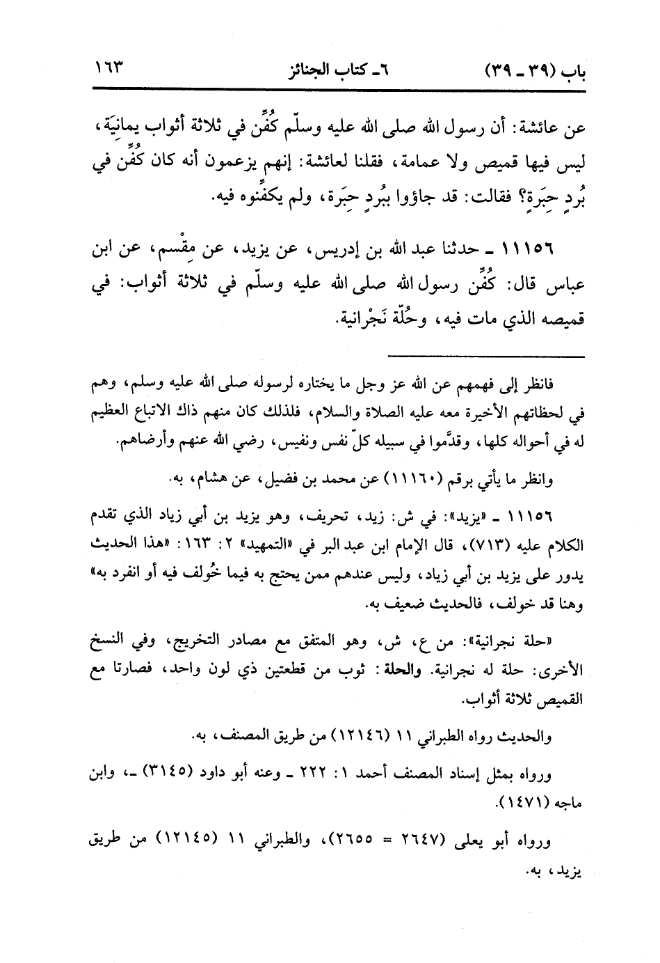 11156- حَدَّثَنَا عَبْدُ اللهِ بْنُ إدْرِيسَ ، عَنْ يَزِيدَ ، عَنْ مِقْسَمٍ ، عَنِ ابْنِ عَبَّاسٍ ، قَالَ : كُفِّنَ رَسُولُ اللهِ صَلَّى الله عَلَيْهِ وَسَلَّمَ فِي ثَلاَثَةِ أَثْوَابٍ فِي قَمِيصِهِ الَّذِي مَاتَ فِيهِ , وَحُلةٍ نَجْرَانِيَّةٍ. (3/258).