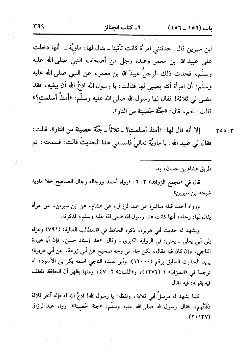 12011- حدَّثَنَا يَزِيدُ بْنُ هَارُونَ ، عَنْ هِشَامِ بْنِ حَسَّانَ ، عَنْ مُحَمَّدِ بْنِ سِيرِينَ ، قَالَ : حَدَّثَتْنِي امْرَأَةٌ كَانَتْ تَأْتِينَا يُقَالُ لَهَا مَاوِيَةٌ ، أَنَّهَا دَخَلَتْ عَلَى عُبَيْدِ اللهِ بْنِ مَعْمَرٍ ، وَعِنْدَهُ رَجُلٌ مِنْ أَصْحَابِ النَّبِيِّ صَلَّى الله عَلَيْهِ وَسَلَّمَ فَحَدَّثَ ذَلِكَ الرَّجُلُ عُبَيْدَ اللهِ بْنَ مَعْمَرٍ : عَنِ النَّبِيِّ صَلَّى الله عَلَيْهِ وَسَلَّمَ ، أَنَّ امْرَأَةً أَتَتْهُ بِصَبِيٍّ لَهَا ، فَقَالَتْ : يَا رَسُولَ اللهِ ادْعُ أَنْ يُبْقِيَهُ فَقَدْ مَضَى لِي ثَلاَثَةٌ ، فَقَالَ : لَهَا رَسُولُ اللهِ صَلَّى الله عَلَيْهِ وَسَلَّمَ : أَمُنْذُ أَسْلَمْت قَالَتْ نَعَمْ ، قَالَ : جُنَّةٌ حَصِينَةٌ مِنَ النَّارِ ، إِلاَّ أَنَّهُ قَالَ لَهَا : أَمُنْذُ أَسْلَمْت ثَلاَثَةٌ جُنَّةٌ حَصِينَةٌ مِنَ النَّارِ قَالَتْ : فَقَالَ لي عُبَيْدُ اللهِ : يَا مَاوِِيَةُ تَعَالَى فَاسْمَعِي هَذَا الْحَدِيثَ , قَالَتْ : فسَمِعْتُهُ ، ثُمَّ خَرَجَتْ مِنْ عِنْدِ عُبَيْدِ اللهِ فَأَتَتْنَا ، وَحَدَّثَتْنَا بِهِ. (3/354).