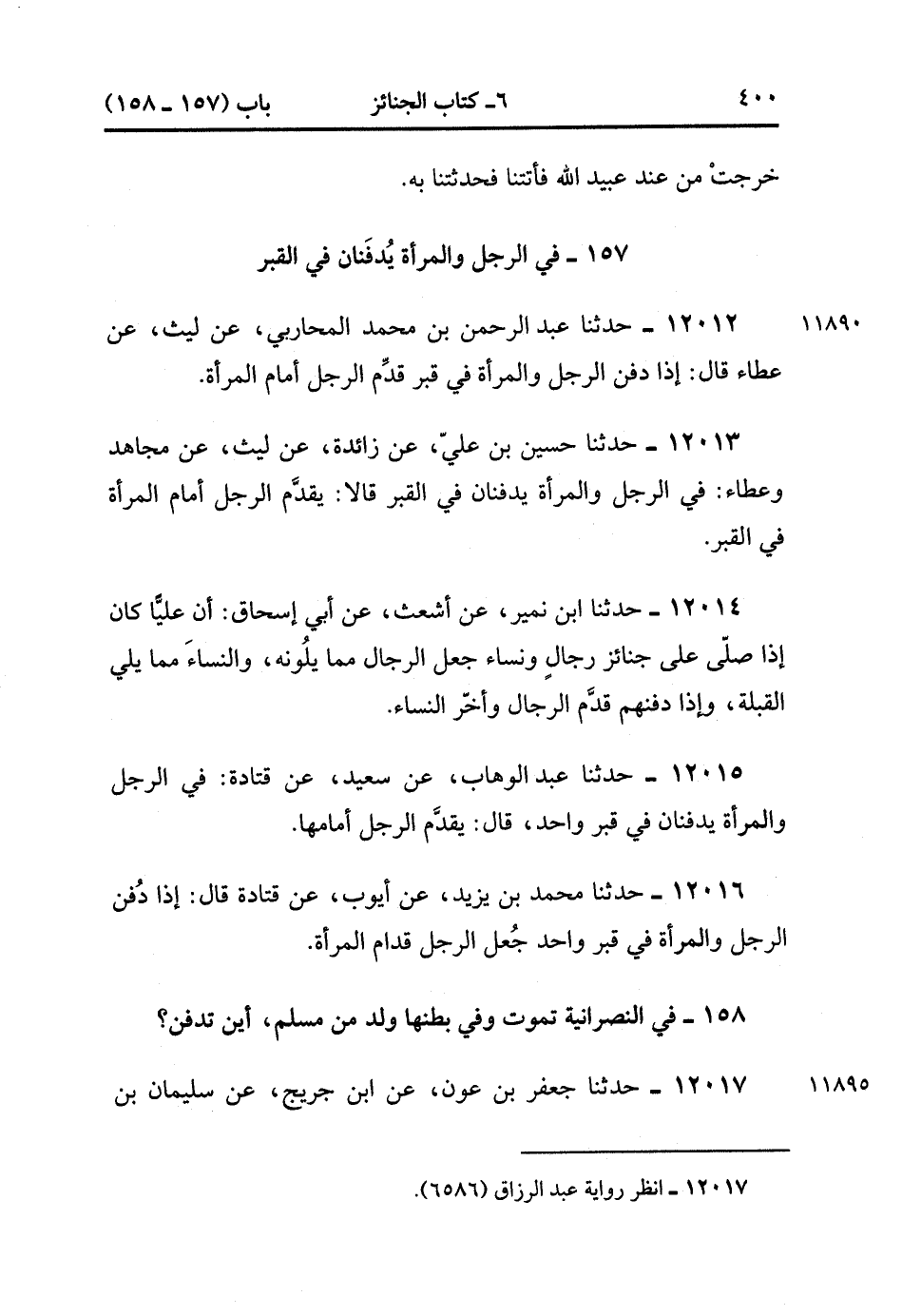 12017- حدَّثَنَا جَعْفَرُ بْنُ عَوْنٍ ، عَنِ ابْنِ جُرَيْجٍ ، عَنْ سُلَيْمَانَ بْنِ مُوسَى ، عَنْ وَاثِلَةَ بْنِ الأَسْقَعِ ؛ فِي امْرَأَةٍ نَصْرَانِيَّةٍ فِي بَطْنِهَا وَلَدٌ مِنْ مُسْلِمٍ ، قَالَ : تُدْفَنُ فِي مَقْبَرَةٍ لَيْسَت مَقْبَرَةَ الْيَهُودِ وَالنَّصَارَى. (3/355).