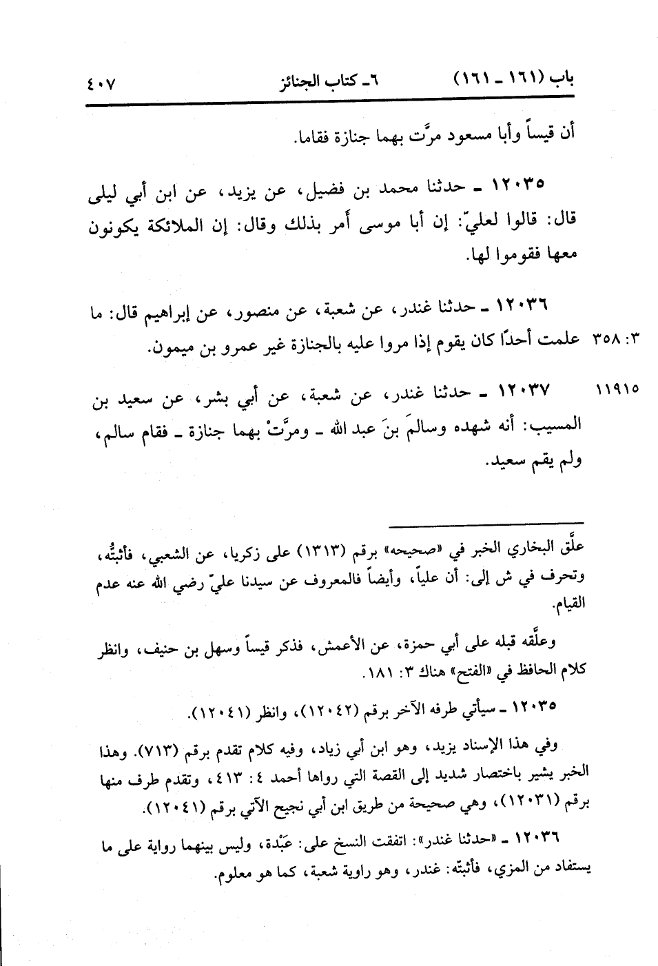 12037- حدَّثَنَا غُنْدَرٌ ، عَنْ شُعْبَةَ ، عَنْ أَبِي بشر ، عَنْ سَعِيدِ بْنِ الْمُسَيَّبِ ، أَنَّهُ شَهِدَه وَسَالِمِ بْنِ عَبْدِ اللهِ وَمَرَّتْ بِهِمَا جِنَازَةٌ فَقَامَ سَالِمٌ ، وَلَمْ يَقُمْ سَعِيدٌ. (3/358).