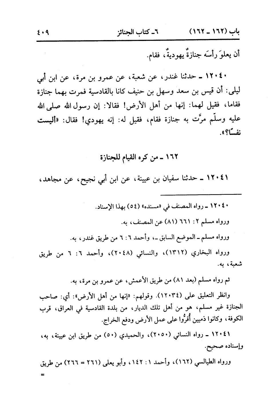 12040- حدَّثَنَا غُنْدَرٌ ، عَنْ شُعْبَةَ ، عَنْ عَمْرِو بْنِ مُرَّةَ ، عَنِ ابْنِ أَبِي لَيْلَى ، أَنَّ قَيْسَ بْنَ سَعْدٍ وَسَهْلَ بْنَ حُنَيْفٍ كَانَا بِالْقَادِسِيَّةِ , فَمَرَّتْ بِهِمَا جِنَازَةٌ فَقَامَا , فَقِيلَ لَهُمَا : إِنَّهَا مِنْ أَهْلِ الأَرْضِ فَقَالاَ : إنَّ رَسُولَ اللهِ صَلَّى الله عَلَيْهِ وَسَلَّمَ مَرَّتْ بِهِ جِنَازَةٌ فَقَامَ فَقِيلَ لَهُ ، أَنَّهُ يَهُودِيٌّ ، فَقَالَ : أَلَيْسَتْ نَفْسًا.