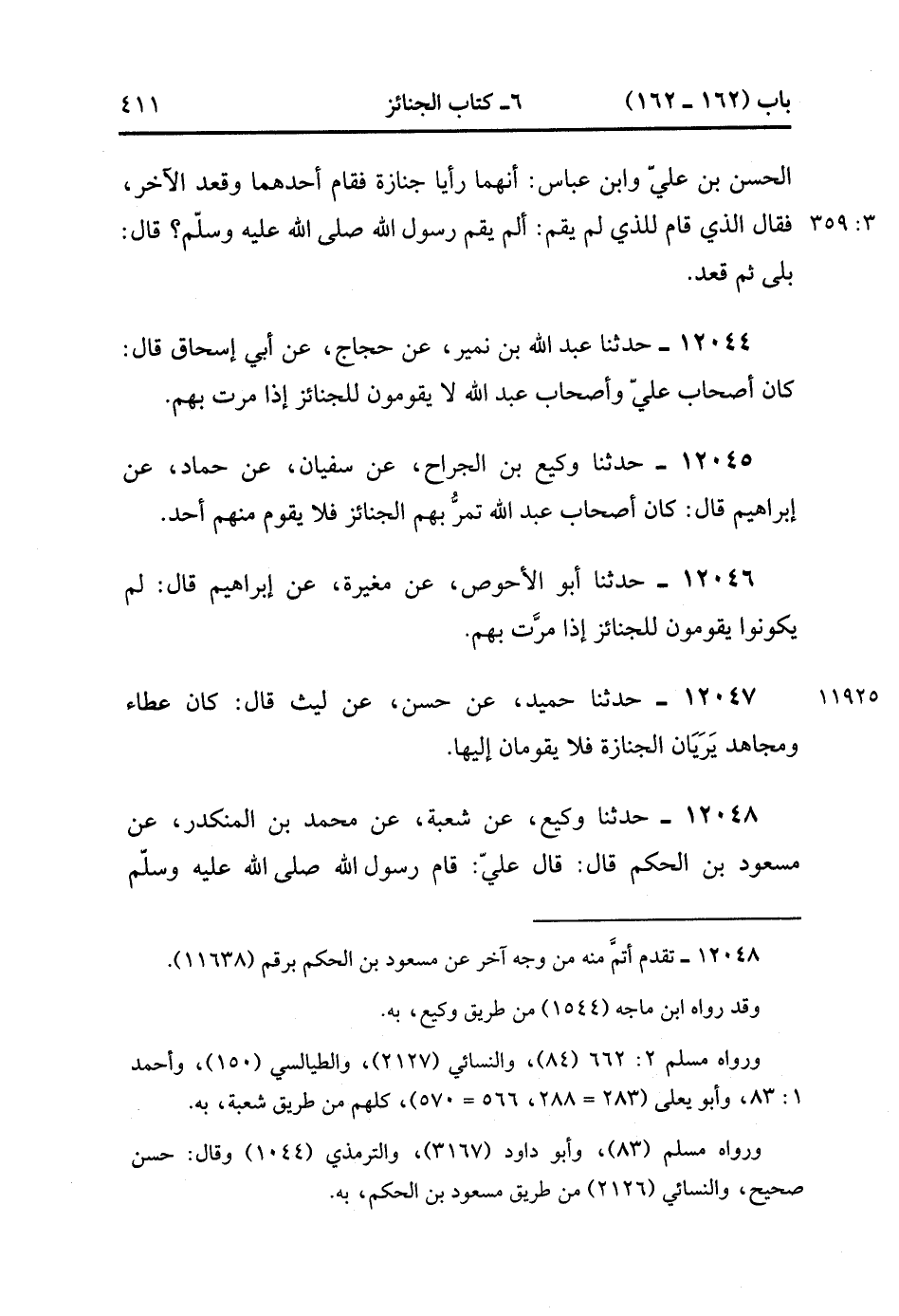 12045- حدَّثَنَا وَكِيعُ بْنُ الْجَرَّاحِ ، عَنْ سُفْيَانَ ، عَنْ حَمَّادٍ ، عَنْ إبْرَاهِيمَ ، قَالَ : كَانَ أَصْحَابُ عَبْدِ اللهِ تَمُرُّ بِهِمُ الْجَنَائِزُ فَلاَ يَقُومُ مِنْهُمْ أَحَدٌ.