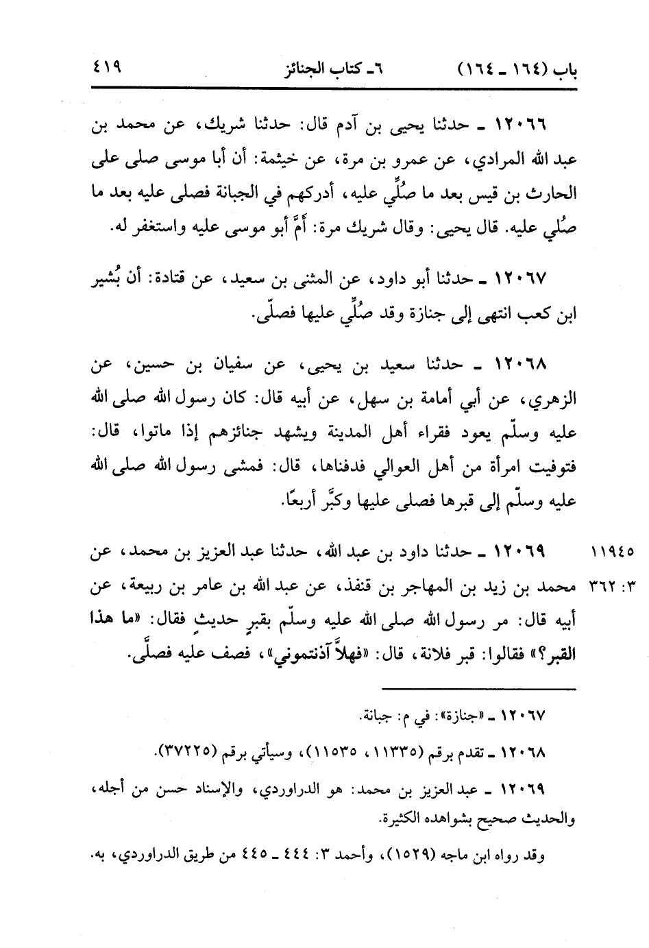 12069- حدَّثَنَا دَاوُد بْنُ عَبْدِ اللهِ ، حدَّثَنَا عَبْدُ الْعَزِيزِ بْنُ مُحَمَّدٍ ، عَنْ مُحَمَّدِ بْنِ زَيْدِ بْنِ الْمُهَاجِرِ بْنِ قُنْفُذٍ ، عَنْ عَبْدِ اللهِ بْنِ عَامِرِ بْنِ رَبِيعَةَ ، عَنْ أَبِيهِ ، قَالَ : مَرَّ رَسُولُ اللهِ صَلَّى الله عَلَيْهِ وَسَلَّمَ بِقَبْرٍ حَدِيثٍ ، فَقَالَ : مَا هَذَا الْقَبْرُ ؟ فَقَالُوا : قَبْرُ فُلاَنَةَ ، قَالَ : فَهَلاَّ آذَنْتُمُونِي , فَصَفَّ عَلَيْهِ فَصَلَّى . (3/361).