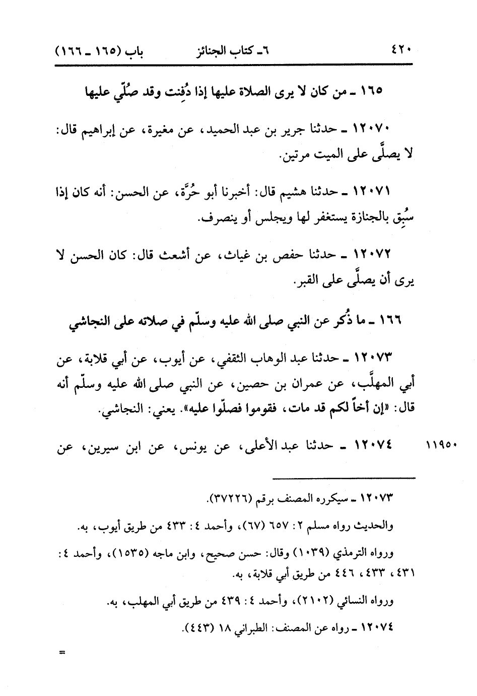 12073- حدَّثَنَا عَبْدُ الْوَهَّابِ الثَّقَفِيُّ ، عَنْ أَيُّوبَ ، عَنْ أَبِي قِلاَبَةَ ، عَنْ أَبِي الْمُهَلَّبِ ، عَنْ عِمْرَانَ بْنِ حُصَيْنٍ ، عَنِ النَّبِيِّ صَلَّى الله عَلَيْهِ وَسَلَّمَ ، أَنَّهُ قَالَ : إنَّ أَخًا لَكُمْ قَدْ مَاتَ , فَقُومُوا فَصَلُّوا عَلَيْهِ , يَعْنِي النَّجَاشِيَّ. (3/362).