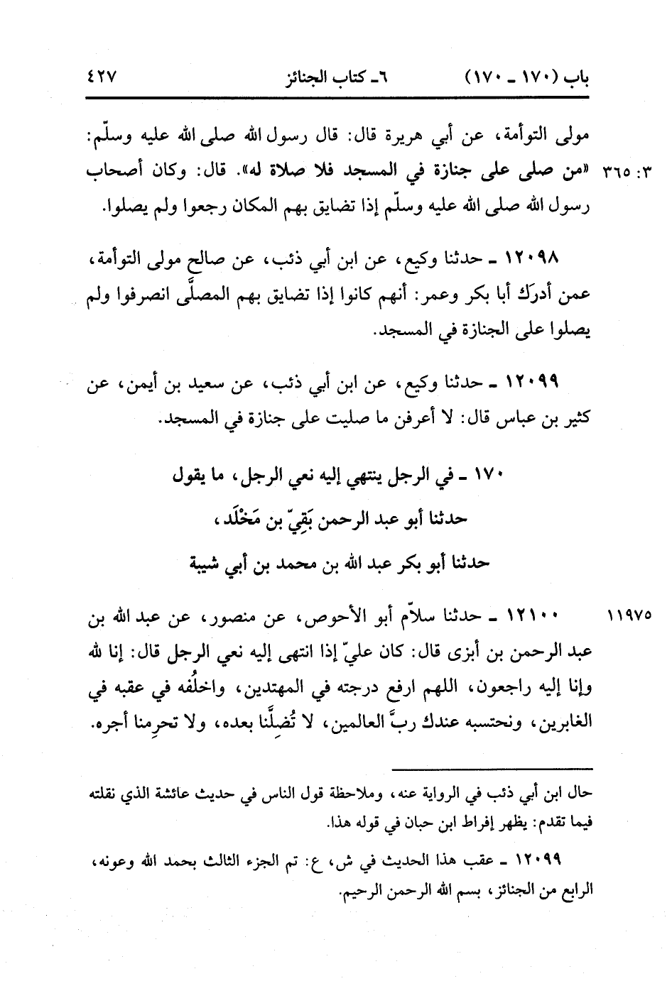12100- حدَّثَنَا سَلاَّمٌ أَبُو الأَحْوَصِِ ، عَنْ مَنْصُورٍ ، عَنْ عَبْدِ اللهِ بْنِ عَبْدِ الرَّحْمَنِ بْنِ أَبْزَى ، قَالَ : كَانَ عَلِيٌّ إذَا انْتَهَى إلَيْهِ نَعْيُ الرَّجُلِ ، قَالَ : إنَّا لِلَّهِ وَإِنَّا إلَيْهِ رَاجِعُونَ , اللَّهُمَّ ارْفَعْ دَرَجَتَهُ فِي الْمُهْتَدِينَ , وَاخْلُفْهُ فِي عَقِبِهِ فِي الْغَابِرِينَ , وَنَحْتَسِبُهُ عِنْدَكَ رَبَّ الْعَالَمِينَ , لاَ تُضِلَّنَا بَعْدَهُ ، وَلاَ تَحْرِمْنَا أَجْرَهُ. (3/365).