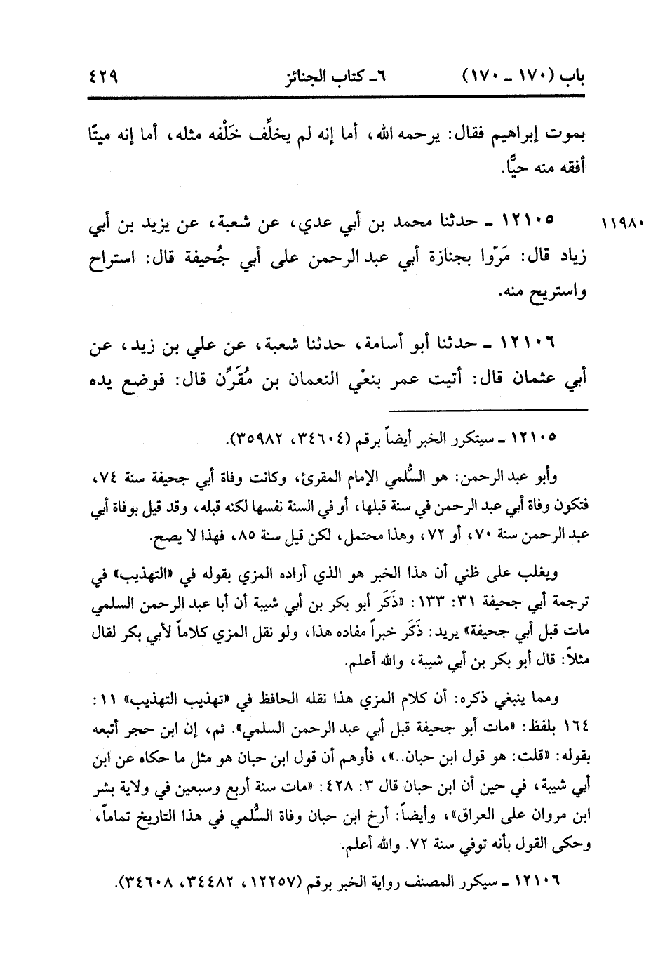 12105- حدَّثَنَا مُحَمَّدُ بْنُ أَبِي عَدِيٍّ ، عَنْ شُعْبَةَ ، عَنْ يَزِيدَ بْنِ أَبِي زِيَادٍ ، قَالَ : مَرُّوا بِجِنَازَةِ أَبِي عَبْدِ الرَّحْمَنِ عَلَى أَبِي جُحَيْفَةَ ، قَالَ : اسْتَرَاحَ ، وَاسْتُرِيحَ مِنْهُ.