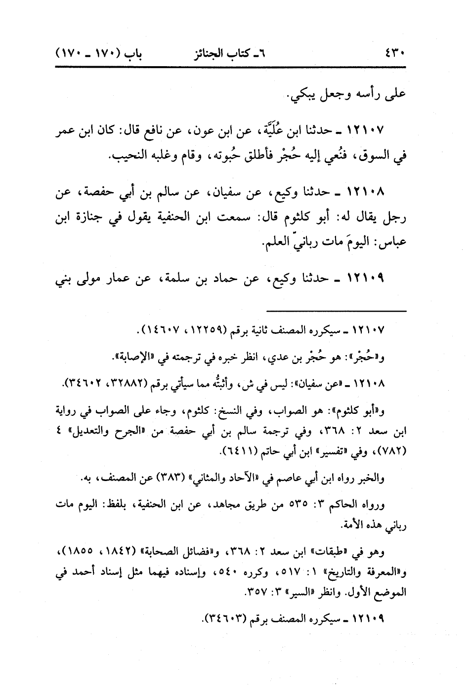 12109- حدَّثَنَا وَكِيعٌ ، عَنْ حَمَّادِ بْنِ سَلَمَةَ ، عَنْ عَمَّارٍ مَوْلَى بَنِي هَاشِمٍ ، قَالَ : جَلَسْنَا فِي ظِلِّ الْقَصْرِ مَعَ ابْنِ عَبَّاسٍ فِي جِنَازَةِ زَيْدِ بْنِ ثَابِتٍ ، فَقَالَ : لَقَدْ دُفِنَ الْيَوْمَ عِلْمٌ كَثِيرٌ. (3/366).