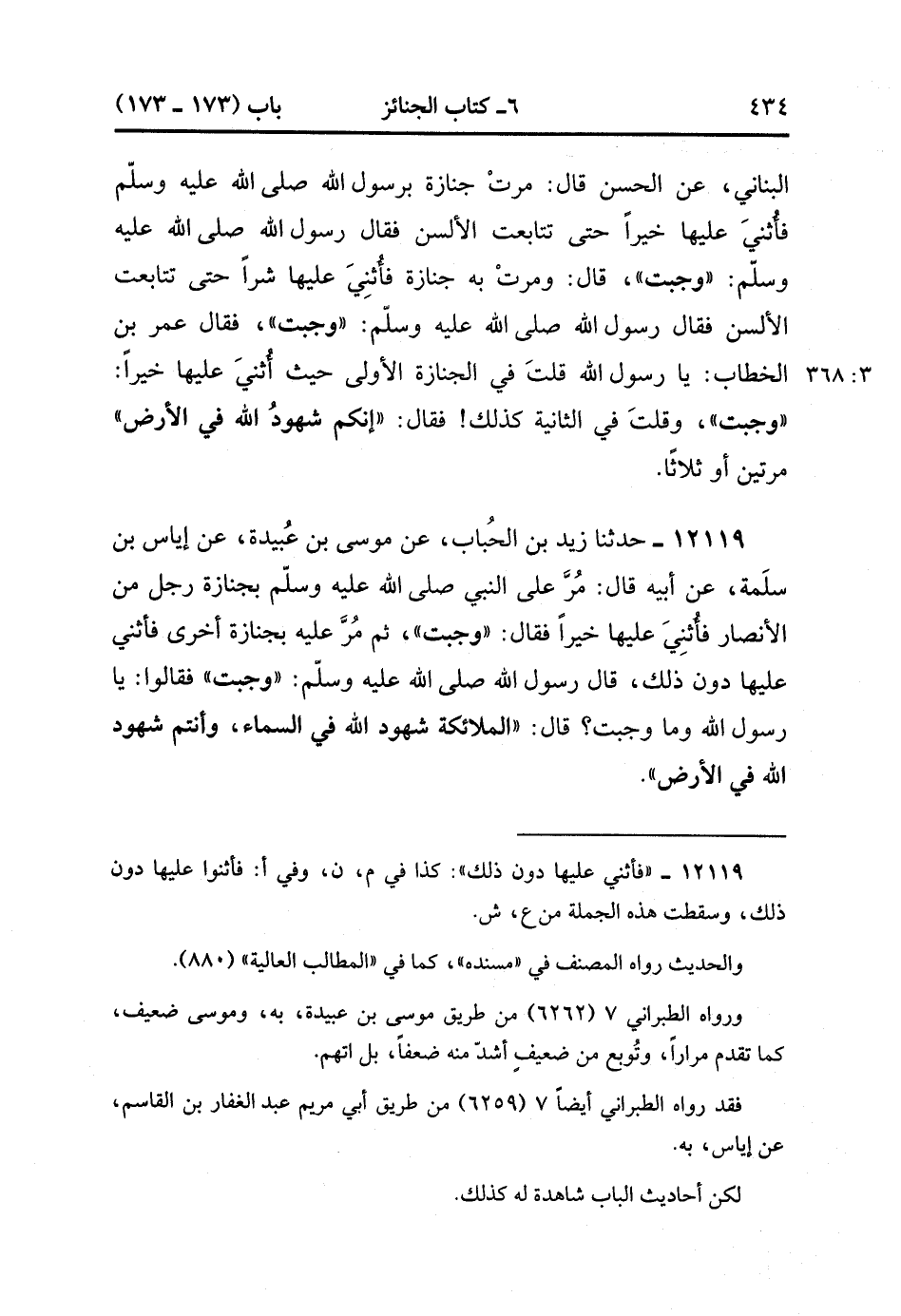 12119- حدَّثَنَا زَيْدُ بْنُ الْحُبَابِ ، عَنْ مُوسَى بْنِ عُبَيْدَةَ ، عَنْ إيَاسِ بْنِ سَلَمَةَ ، عَنْ أَبِيهِ ، قَالَ : مُرَّ عَلَى النَّبِيِّ صَلَّى الله عَلَيْهِ وَسَلَّمَ بِجِنَازَةِ رَجُلٍ مِنَ الأَنْصَارِ فَأُثْنِيَ عَلَيْهَا خَيْرًا ، فَقَالَ : وَجَبَتْ ، ثُمَّ مُرَّ عَلَيْهِ بِجِنَازَةٍ أُخْرَى فَأُثْنِيَ عَلَيْهَا دُونَ ذَلِكَ ، فَقَالَ رَسُولُ اللهِ صَلَّى الله عَلَيْهِ وَسَلَّمَ : وَجَبَتْ فَقَالُوا : يَا رَسُولَ اللهِ وَمَا وَجَبَتْ ، قَالَ : الْمَلاَئِكَةُ شُهُودُ اللهِ فِي السَّمَاءِ وَأَنْتُمْ شُهُودُ اللهِ فِي الأَرْضِ. (3/368).