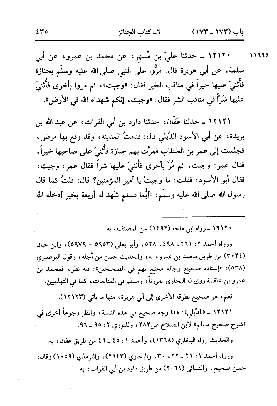 12121- حدَّثَنَا عَفَّانَ ، حدَّثَنَا دَاوُد بْنِ أَبِي الْفُرَاتِ ، عَنْ عَبْدِ اللهِ بْنِ بُرَيْدَةَ ، عَنْ أَبِي الأَسْوَد الدِّيَلِيِّ ، قَالَ : قَدِمْت الْمَدِينَةَ وَقَدْ وَقَعَ بِهَا مَرَضٌ , فَجَلَسْت إلَى عُمَرَ بْنِ الْخَطَّابِ , فَمَرَّتْ بِهِمْ جِنَازَةٌ , فَأُثْنِيَ عَلَى صَاحِبهَا خَيْرا ، فَقَالَ عُمَرُ : وَجَبَتْ ، ثُمَّ مُرَّ بِأُخْرَى فَأُثْنِيَ عَلَيْهَا شَرًّا ، فَقَالَ عُمَرُ : وَجَبَتْ ، فَقَالَ أَبُو الأَسْوَد : فَقُلْت وَمَا وَجَبَتْ يَا أَمِيرَ الْمُؤْمِنِينَ ؟ قَالَ : قُلْتُ كَمَا قَالَ رَسُولُ اللهِ صَلَّى الله عَلَيْهِ وَسَلَّمَ , أَيُّمَا مُسْلِمٍ يَشْهَدُ لَهُ أَرْبَعَةٌ بِخَيْرٍ أَدْخَلَهُ اللَّهُ الْجَنَّةَ , فَقُلْنَا وَثَلاَثَةٌ ؟ قَالَ : وَثَلاَثَةٌ , فَقُلْنَا وَاثْنَانِ ، قَالَ وَاثْنَانِ ، ثُمَّ لَمْ نَسْأَلْهُ عَنِ الْوَاحِدِ. (3/368).