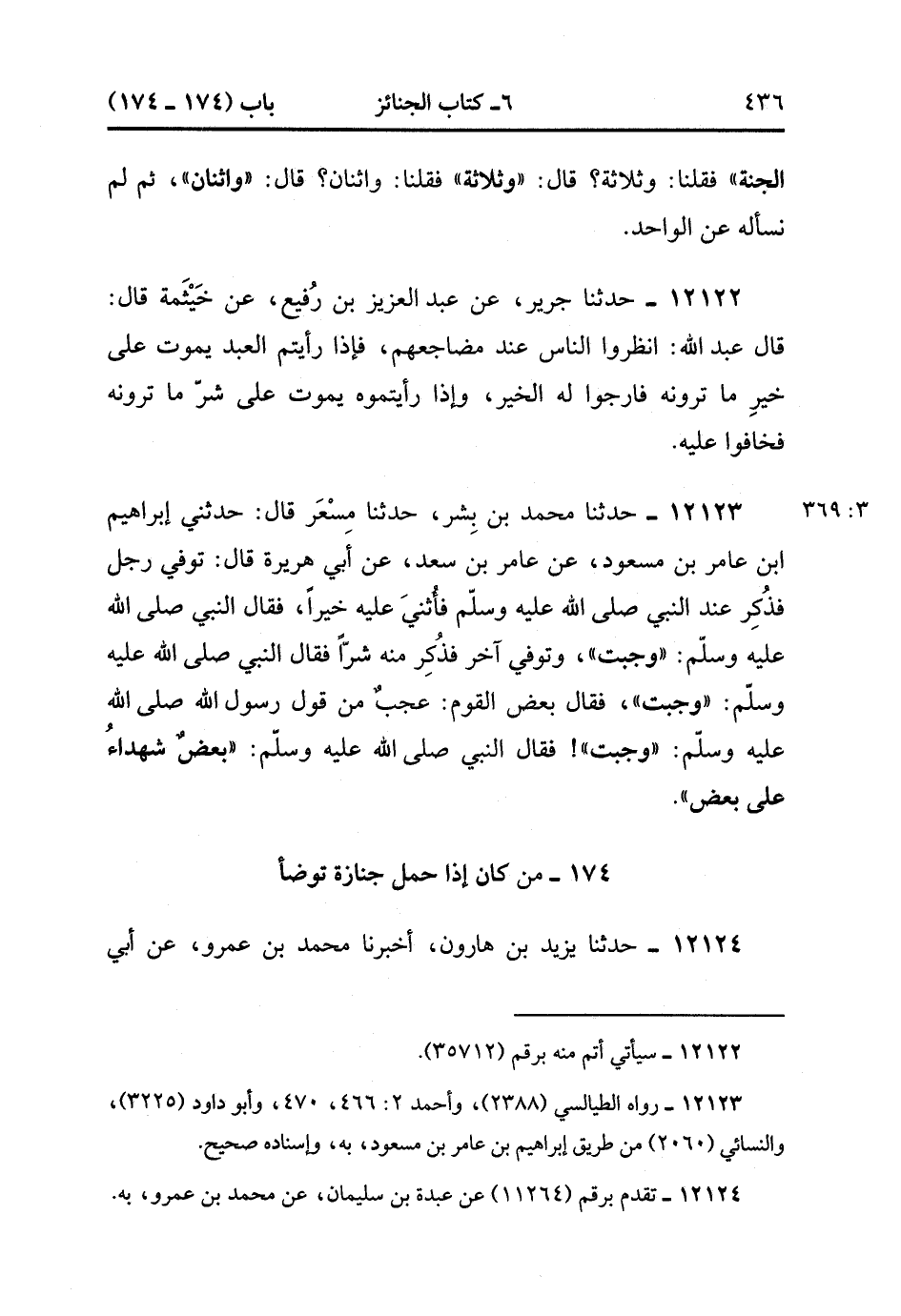 12123- حدَّثَنَا مُحَمَّدُ بْنُ بِشْرٍ ، حدَّثَنَا مِسْعر ، قَالَ : حَدَّثَنِي إبْرَاهِيمُ بْنُ عَامِرِ بْنِ مَسْعُودٍ ، عَنْ عَامِرِ بْنِ سَعْدٍ ، عَنْ أَبِي هُرَيْرَةَ ، قَالَ : تُوُفِّيَ رَجُلٌ فَذُكِرَ عِنْدَ النَّبِيِّ فَأُثْنِيَ عَلَيْهِ خَيْرٌ ، فَقَالَ : وَجَبَتْ وَتُوُفِّيَ آخَرُ فَذُكِرَ مِنْهُ شَرٌّ ، فَقَالَ النَّبِيُّ صَلَّى الله عَلَيْهِ وَسَلَّمَ وَجَبَتْ ، فَقَالَ بَعْضُ الْقَوْمِ : عَجَبٌ مِنْ قَوْلِ رَسُولِ اللهِ صَلَّى الله عَلَيْهِ وَسَلَّمَ وَجَبَتْ ، فَقَالَ النَّبِيُّ صَلَّى الله عَلَيْهِ وَسَلَّمَ : بَعْضٌ شُهَدَاءُ عَلَى بَعْضٍ. (3/368)