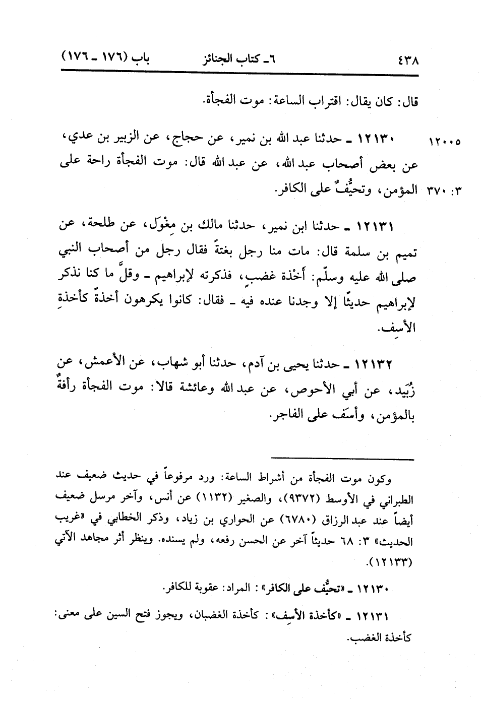 12130- حدَّثَنَا عَبْدُ اللهِ بْنُ نُمَيْرٍ ، عَنْ حَجَّاجٍ ، عَنِ الزُّبَيْرِ بْنِ عَدِيٍّ ، عَنْ بَعْضِ أَصْحَابِ عَبْدِ اللهِ ، عَنْ عَبْدِ اللهِ ، قَالَ : مَوْتُ الْفَجْأةِ رَاحَةٌ عَلَى الْمُؤْمِنِينَ وَتَحَيُّفٌ عَلَى الْكَافِرِ. (3/369)