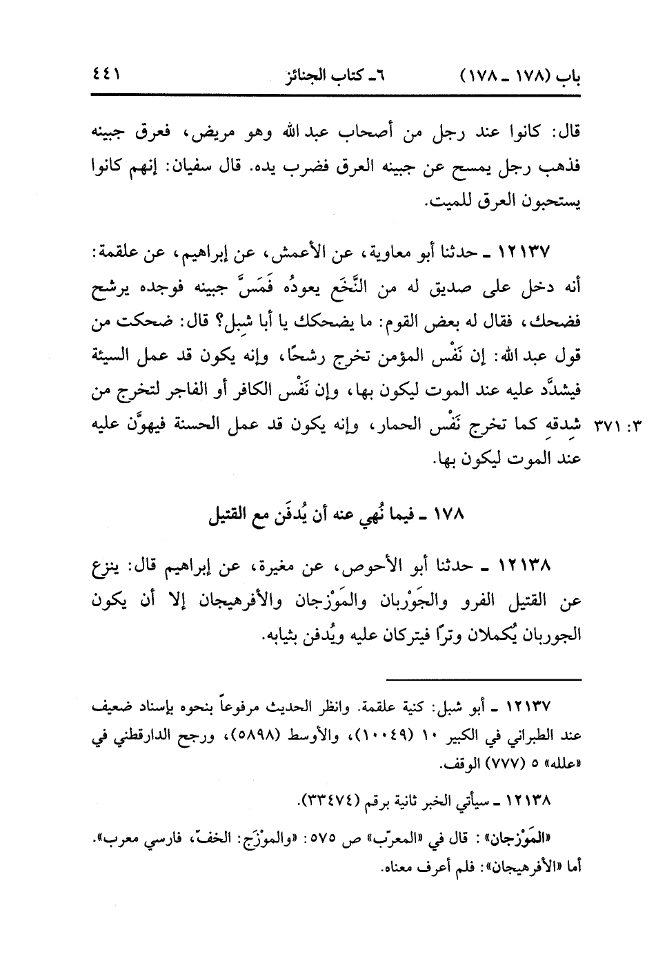 12138- حدَّثَنَا أَبُو الأَحْوَصِِ ، عَنْ مُغِيرَةَ ، عَنْ إبْرَاهِيمَ ، قَالَ : يُنْزَعُ عَنِ الْقَتِيلِ الْفَرْوُ , وَالْجَوْرَبَانِ , وَالْموْزَجَانِ ، والأفرهيجان إِلاَّ أَنْ يَكُونَ الجَوْرَبَانِ يُكَمِلان وترًا فَيُتْرَكَانِ عَلَيْهِ , وَيُدْفَنُ بثِيَابِهِ. (3/371).