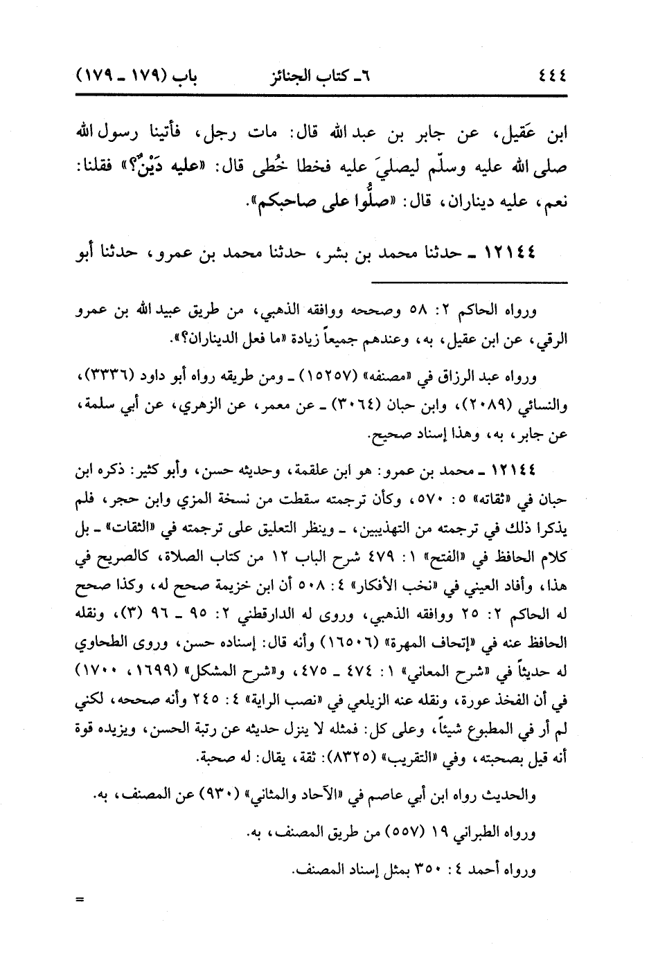 12144- حدَّثَنَا مُحَمَّدُ بْنُ بِشْرٍ ، حدَّثَنَا مُحَمَّدُ بْنُ عَمْرٍو ، حدَّثَنَا أَبُو كَثِيرٍ مَوْلَى اللَّيْثِيِّينَ ، عَنْ مُحَمَّدِ بْنِ عَبْدِ اللهِ بْنِ جَحْشٍ ؛ أَنَّ رَجُلاً جَاءَ إلَى النَّبِيِّ صَلَّى الله عَلَيْهِ وَسَلَّمَ ، فَقَالَ : يَا رَسُولَ اللهِ مَا لِي إِنْ قُتِلْت فِي سَبِيلِ اللهِ ، قَالَ : الْجَنَّةُ ، فَلَمَّا وَلَّى ، قَالَ : إِلاَّ الدَّيْنَ سَارَّنِي بِهِ جِبْرِيلُ آنِفًا. (3/372).