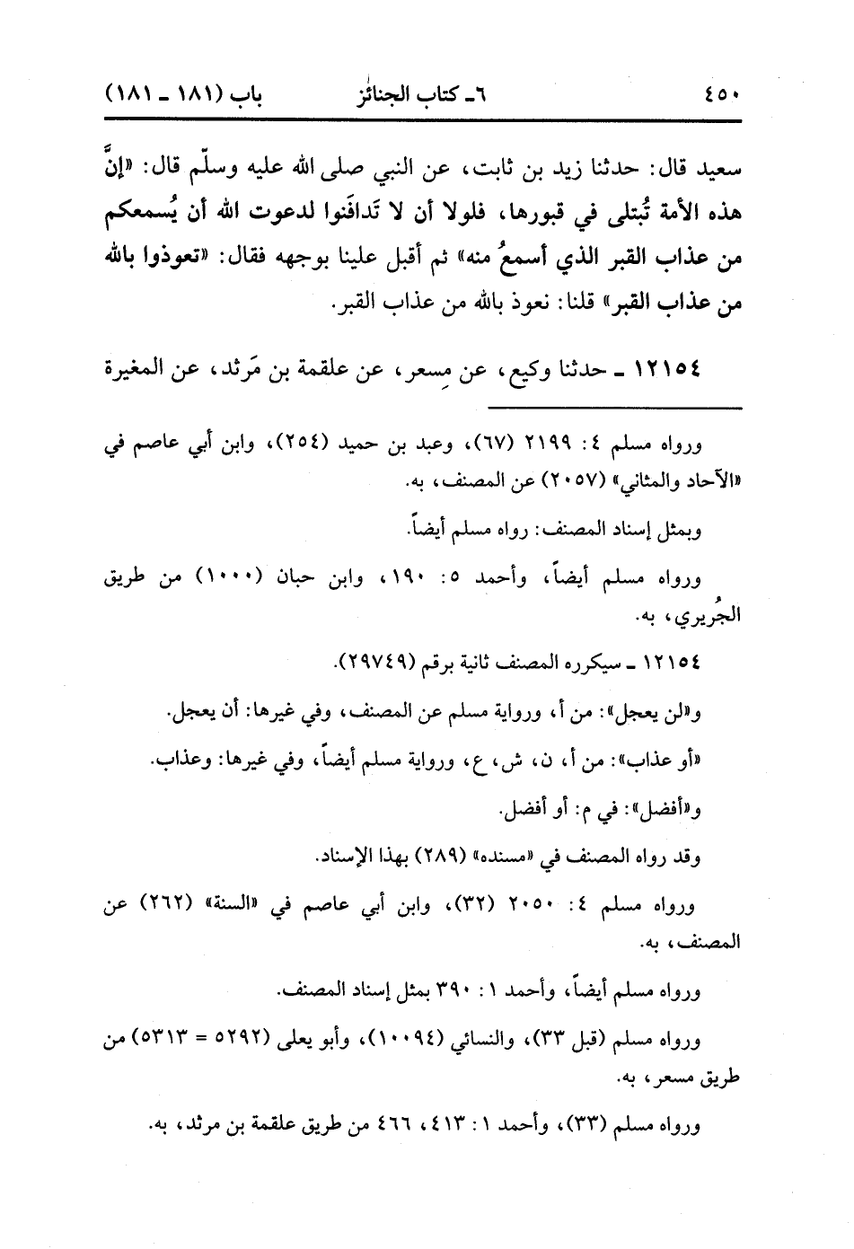 12153- حدَّثَنَا ابْنُ عُلَيَّةَ ، عَنِ الْجُرَيْرِيِّ ، عَنْ أَبِي نَضْرَةَ ، عَنْ أَبِي سَعِيدٍ , قَالَ : حدَّثَنَا زَيْدُ بْنُ ثَابِتٍ , عَنِ النَّبِيِّ صَلَّى الله عَلَيْهِ وَسَلَّمَ ، قَالَ : إنَّ هَذِهِ الأُمَّةَ تُبْتَلَى فِي قُبُورِهَا فَلَوْلاَ أَنْ لاَ تَدَافَنُوا لَدَعَوْت اللَّهَ أَنْ يُسْمِعَكُمْ مِنْ عَذَابِ الْقَبْرِ الَّذِي أَسْمَعُ مِنْهُ ، ثُمَّ أَقْبَلَ عَلَيْنَا بِوَجْهِهِ ، فَقَالَ : تَعَوَّذُوا بِاللَّهِ مِنْ عَذَابِ الْقَبْرِ قُلْنَا نَعُوذُ بِاللَّهِ مِنْ عَذَابِ الْقَبْرِ.
