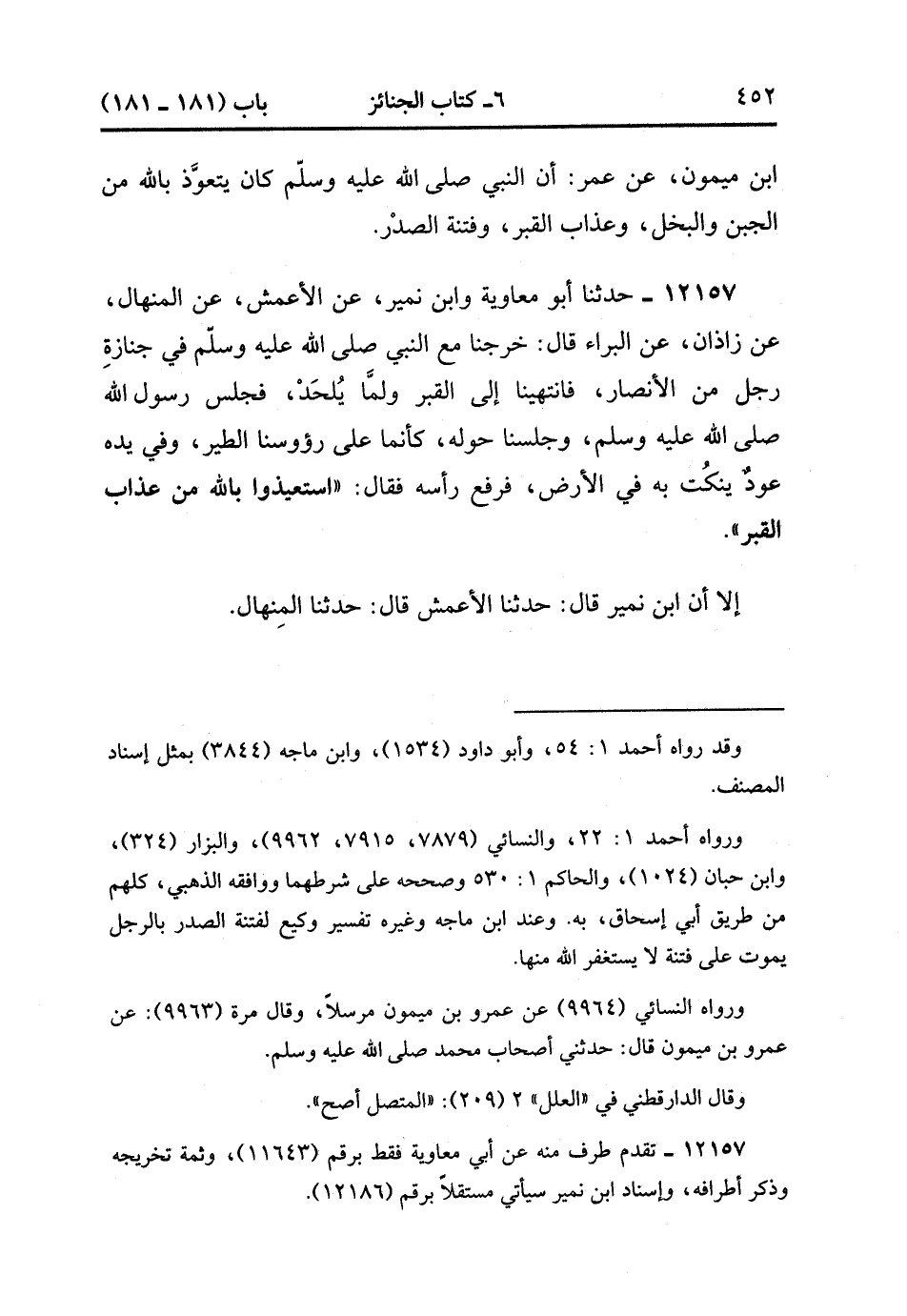 12157- حدَّثَنَا أَبُو مُعَاوِيَةَ وَابْنِ نُمَيْرٍ ، عَنِ الأَعْمَشِ ، عَنِ الْمِنْهَالِ ، عَنْ زَاذَانَ : عَنِ الْبَرَاءِ ، قَالَ : خَرَجْنَا مَعَ النَّبِيِّ صَلَّى الله عَلَيْهِ وَسَلَّمَ فِي جِنَازَةِ رَجُلٍ مِنَ الأَنْصَارِ فَانْتَهَيْنَا إلَى الْقَبْرِ وَلَمَّا يُلْحَدْ , فَجَلَسَ النَّبِيُّ صَلَّى الله عَلَيْهِ وَسَلَّمَ وَجَلَسْنَا حَوْلَهُ , كَأَنَّمَا عَلَى رُؤُوسِنَا الطَّيْرُ , وَفِي يَدِهِ عُودٌ يَنْكُتُ بِهِ فِي الأَرْضِ , فَرَفَعَ رَأْسَهُ ، فَقَالَ : اسْتَعِيذُوا بِاللَّهِ مِنْ عَذَابِ الْقَبْرِ ، إِلاَّ أَنَّ ابْنَ نُمَيْرٍ ، قَالَ حدَّثَنَا الأَعْمَشُ , قَالَ : حدَّثَنَا الْمِنْهَالُ. (3/374).
