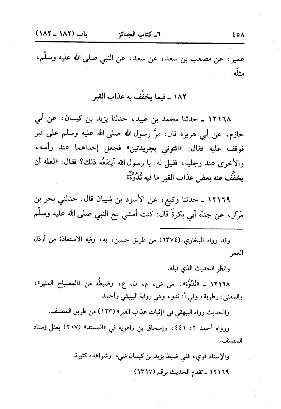 12169- حدَّثَنَا وَكِيعٌ ، عَنِ الأَسْوَد بْنِ شَيْبَانَ ، قَالَ : حدَّثَنِي بَحْرُ بْنُ مَرَّارٍ ، عَنْ جَدِّهِ أَبِي بَكْرَةَ ، قَالَ : كُنْتُ أَمْشِي مَعَ النَّبِيِّ صَلَّى الله عَلَيْهِ وَسَلَّمَ فَمَرَّ عَلَى قَبْرَيْنِ ، فَقَالَ : إنَّهُمَا لَيُعَذَّبَانِ مَنْ يَأْتِينِي بِجَرِيدَةٍ ؟ فَاسْتَبَقْتُ أَنَا وَرَجُلٌ فَأَتَيْنَا بِهَا ، قَالَ : فَشَقَّهَا مِنْ رَأْسِهَا , فَغَرَسَ عَلَى هَذَا وَاحِدَةً , وَعَلَى هَذَا وَاحِدَةً ، وَقَالَ : لَعَلَّه يُخَفَّفُ عَنْهُمَا مَا بَقِيَ فِيهِمَا مِنْ بُلُولَتِهِمَا شَيْءٌ , إن يُعَذَّبَانِ لفِي الْغِيبَةِ وَالْبَوْلِ. (3/376).