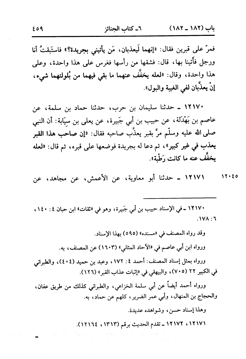12170- حدَّثَنَا سُلَيْمَانُ بْنُ حَرْبٍ ، حدَّثَنَا أَبُو سَلَمَةَ حَمَّادُ بْنُ سَلَمَةَ ، عَنْ عَاصِمِ بْنِ بَهْدَلَةَ ، عَنْ حَبِيبِ بْنِ أَبِي جَبِيرَةَ (1)، عَنْ يَعْلَى بْنُ سِيَابَةَ ؛ أَنَّ النَّبِيَّ صَلَّى الله عَلَيْهِ وَسَلَّمَ مَرَّ بِقَبْرٍ يُعَذَّبُ صَاحِبُهُ ، فَقَالَ : إنَّ صَاحِبَ هَذَا الْقَبْرِ يُعَذَّبُ فِي غَيْرِ كَبِيرٍ ، ثُمَّ دَعَا بِجَرِيدَةٍ فَوَضَعَهَا عَلَى قَبْرِهِ ، ثُمَّ قَالَ : لَعَلَّهُ يُخَفِّفُ عَنْهُ مَا كَانَتْ رَطْبَةً. (3/376).