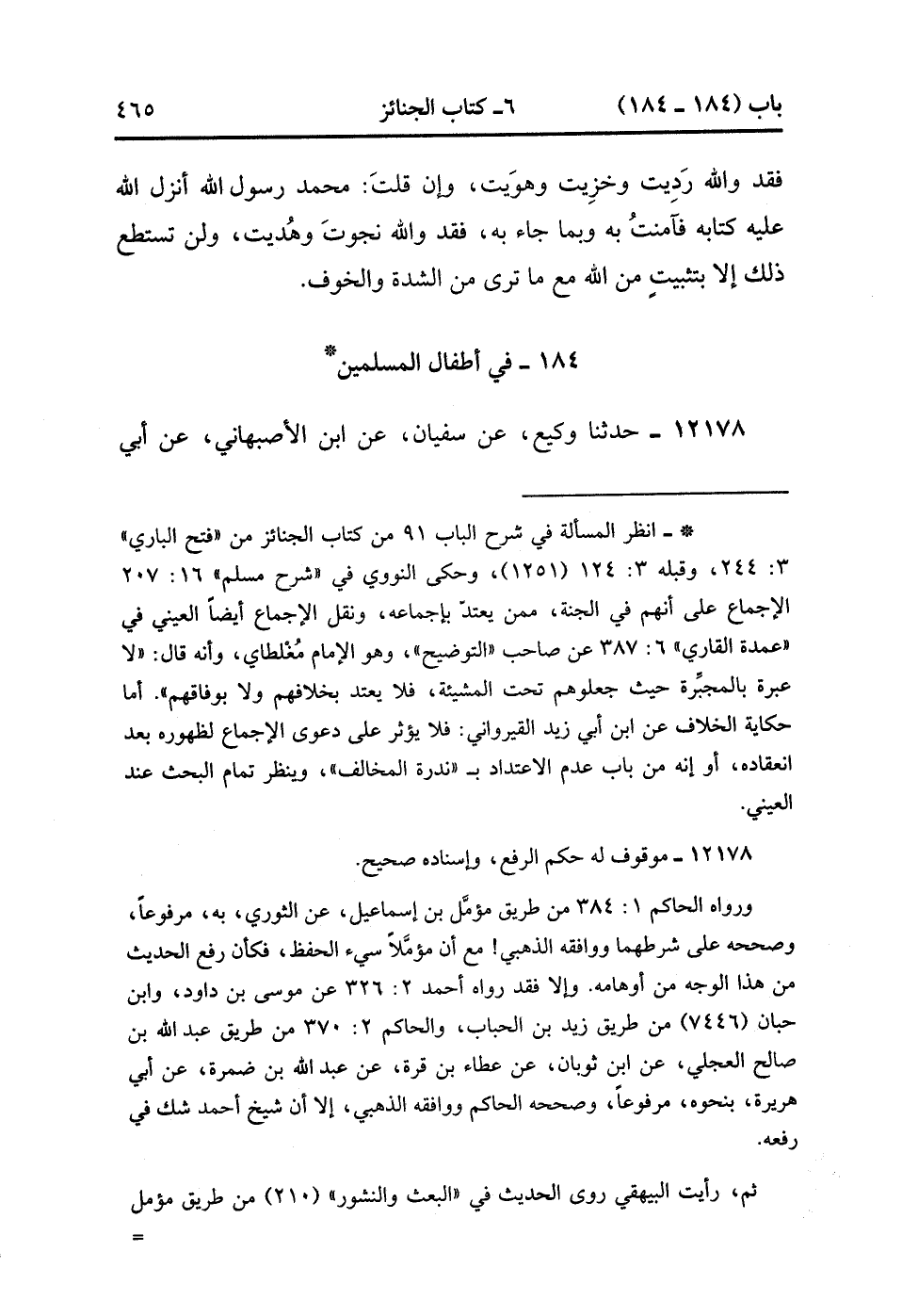 12178- حدَّثَنَا وَكِيعٌ ، عَنْ سُفْيَانَ ، عَنِ ابْنِ الأَصْبَهَانِيِّ ، عَنْ أَبِي حَازِمٍ ، عَنْ أَبِي هُرَيْرَةَ ، قَالَ : أَطْفَالُ الْمُسْلِمِينَ فِي جَبَلٍ بَيْنَ إبْرَاهِيمَ وَسَارَةَ يَكْفُلُونَهُمْ. (3/379).