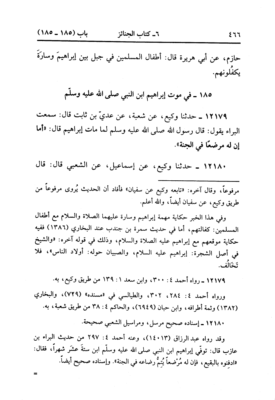 12179- حدَّثَنَا وَكِيعٌ ، عَنْ شُعْبَةُ ، عَنْ عَدِيِّ بْنِ ثَابِتٍ ، قَالَ : سَمِعْتُ الْبَرَاءَ يَقُولُ : قَالَ رَسُولُ اللهِ صَلَّى الله عَلَيْهِ وَسَلَّمَ : لَمَّا مَاتَ إبْرَاهِيمُ ، قَالَ : أَمَا إنَّ لَهُ مُرْضِعًا فِي الْجَنَّةِ.