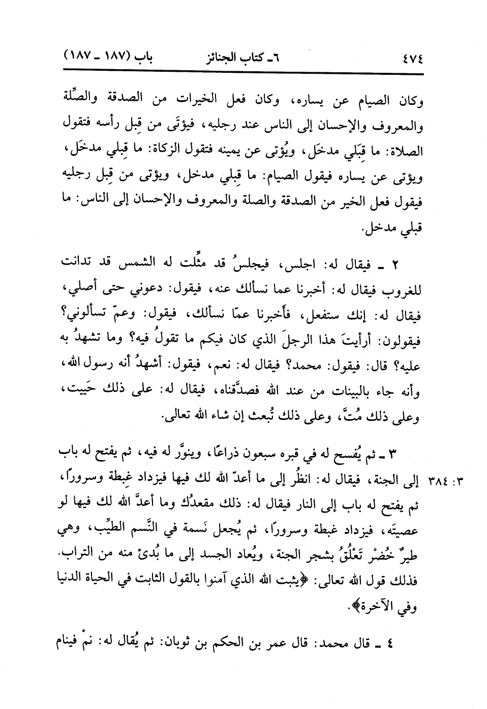 ثُمَّ يُفْسَحُ لَهُ فِي قَبْرِهِ سَبْعُونَ ذِرَاعًا وَيُنَوَّرُ لَهُ فِيهِ ، ثُمَّ يُفْتَحُ لَهُ بَابٌ إلَى الْجَنَّةِ فَيُقَالُ لَهُ انْظُرْ إلَى مَا أَعَدَّ اللَّهُ لَكَ فِيهَا(3/383)فَيَزْدَادُ غِبْطَةً وَسُرُورًا ، ثُمَّ يُفْتَحُ لَهُ بَابٌ إلَى النَّارِ ، فَيُقَالُ لَهُ : ذَلِكَ مَقْعَدُك وَمَا أَعَدَّ اللَّهُ لَكَ فِيهَا لَو عَصَيته فَيَزْدَادُ غِبْطَةً وَسُرُورًا ثُمَّ يُجْعَلُ نَسَمَةً في النَّسْمِ الطَّيِّبِ وَهِيَ طَيْرٌ خُضْرٌ تَعَلَّقَ بِشَجَرِ الْجَنَّةِ وَيُعَادُ الْجِسْمُ إلَى مَا بُدِأَ مِنْهُ مِنَ التُّرَابِ فَذَلِكَ قَوْلُ اللهِ تَعَالَى : {يُثَبِّتُ اللَّهُ الَّذِينَ آمَنُوا بِالْقَوْلِ الثَّابِتِ فِي الْحَيَاةِ الدُّنْيَا ، وَفِي الآخِرَةِ} , قَالَ مُحَمَّدٌ ، قَالَ عُمَرُ بْنُ الْحَكَمِ بْنِ ثَوْبَانَ : ثُمَّ يُقَالُ لَهُ نَمْ فَيَنَامُ نَوْمَةِ الْعَرُوسِ لاَ يُوقِظُهُ إِلاَّ أُحِبُّ أَهْلِهِ إلَيْهِ , حَتَّى يَبْعَثَهُ اللَّهُ عَزَّ وَجَلَّ ، قَالَ مُحَمَّدٌ ، قَالَ أَبُو سَلَمَةَ ، قَالَ أَبُو هُرَيْرَةَ ، وَإِنْ كَانَ كَافِرًا فَيؤْتَي مِنْ قِبَلِ رَأْسِهِ , فَلاَ يُوجَدُ لَهُ شَيْءٌ ، ثُمَّ يَأْتِي عَنْ يَمِينِهِ فَلاَ يُوجَدُ لَهُ شَيْءٌ ، ثُمَّ يَأْتِي عَنْ شِمَالِهِ فَلاَ يُوجَدُ لَهُ شَيْءٌ ، ثُمَّ يَأْتِي مِنْ قِبَلِ رِجْلَيْهِ فَلاَ يُوجَدُ لَهُ شَيْءٌ , فَيُقَالُ لَهُ : اجْلِسْ فَيَجْلِسُ فَزِعًا مَرْعُوبًا , فَيُقَالُ لَهُ : أَخْبِرْنَا عَمَّا نَسْأَلُك عَنْهُ ؟ فَيَقُولُ : وَعَمَّ تَسْأَلُونِي ؟ فَيُقَالُ : أَرَأَيْت هَذَا الرَّجُلَ الَّذِي كَانَ فِيكُمْ مَاذَا تَقُولُ فِيهِ وَمَاذَا تَشْهَدُ بِهِ عَلَيْهِ ، قَالَ : فَيَقُولُ : أَيُّ رَجُلٍ ؟ قَالَ : فَيُقَالُ الَّذِي فِيكُمْ فَلاَ يَهْتَدِي لاِسْمِهِ ، فَيُقَالُ : مُحَمَّدٌ فَيَقُولُ : لاَ أَدْرِي سَمِعْت النَّاسَ يَقُولُونَ قَوْلاً فَقُلْت كَمَا قَالُوا : فَيُقَالُ عَلَى ذَلِكَ حَيِيتَ , وَعَلَى ذَلِكَ مُتَّ , وَعَلَى ذَلِكَ تَبْعَثُ إِنْ شَاءَ اللَّهُ ، ثُمَّ يُفْتَحُ لَهُ بَابٌ إلَى النَّارِ ، فَيُقَالُ لَهُ ذَلِكَ مَقْعَدُك وَمَا أَعَدَّ اللَّهُ لَكَ فِيهَا , فَيَزْدَادُ حَسْرَةً وَثُبُورًا ، ثُمَّ يُفْتَحُ لَهُ بَابٌ إلَى الجَنَّةَ فَيُقَالُ لَهُ ذَلِكَ مَقْعَدُك مِنْهَا فَيَزْدَاد حَسْرَةً وَثُبُورًا ، ثُمَّ يُضَيَّقُ عَلَيْهِ قَبْرُهُ حَتَّى تَخْتَلِفَ أَضْلاَعُهُ , وَهِيَ الْمَعِيشَةُ الضَّنْكُ الَّتِي قَالَ اللَّهُ تَعَالَى : {فَإِنَّ لَهُ مَعِيشَةً ضَنْكًا وَنَحْشُرُهُ يَوْمَ الْقِيَامَةِ أَعْمَى}.(3/384).