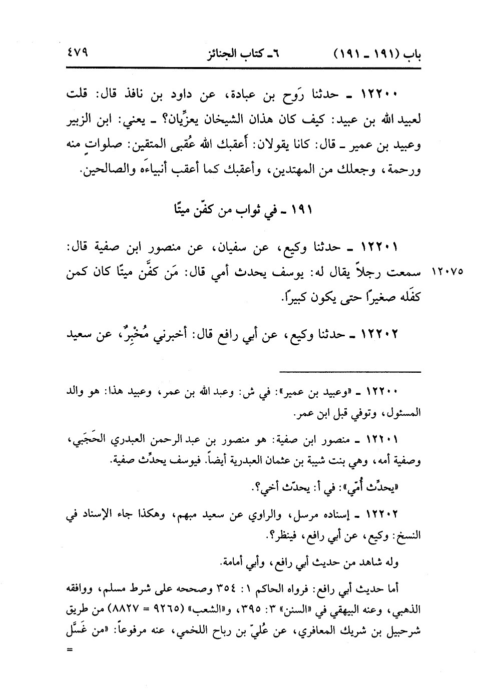 12201- حدَّثَنَا وَكِيعٌ ، عَنْ سُفْيَانَ ، عَنْ مَنْصُورِ بْنِ صَفِيَّةَ ، قَالَ : سَمِعْتُ رَجُلاً يُقَالُ لَهُ يُوسُفُ يُحَدِّثُ أُمِّي ، قَالَ : مَنْ كَفَّنَ مَيِّتًا كَانَ كَمَنْ كَفَلَهُ صَغِيرًا حَتَّى يَكُونَ كَبِيرًا.