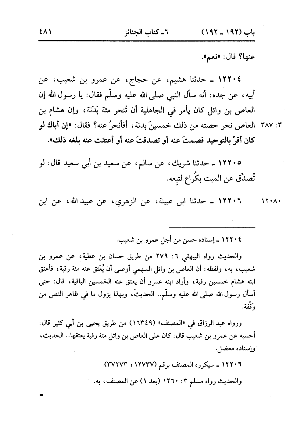 12204- حدَّثَنَا هُشَيْمٌ ، عَنْ حَجَّاجٍ ، عَنْ عَمْرِو بْنِ شُعَيْبٍ ، عَنْ أَبِيهِ ، عَنْ جَدِّهِ ، أَنَّهُ سَأَلَ النَّبِيَّ صَلَّى الله عَلَيْهِ وَسَلَّمَ ، فَقَالَ : يَا رَسُولَ اللهِ إنَّ الْعَاصِ بْنَ وَائِلٍ كَانَ يَأْمُرُ فِي الْجَاهِلِيَّةِ أَنْ تُنْحَرَ مِئَة بَدَنَةٍ , وَإِنَّ هِشَامَ بْنَ الْعَاصِ نَحَرَ حِصَّتَهُ مِنْ ذَلِكَ خَمْسِينَ بَدَنَةً , أَفَأَنْحَرُ عَنْهُ ، فَقَالَ : إنَّ أَبَاك لَوْ كَانَ أَقَرَّ بِالتَّوْحِيدِ فَصُمْت عَنْهُ ، أَوْ تَصَدَّقْت عَنْهُ ، أَوْ أَعْتَقْتَ عَنْهُ بَلَغَهُ ذَلِكَ. (3/386)