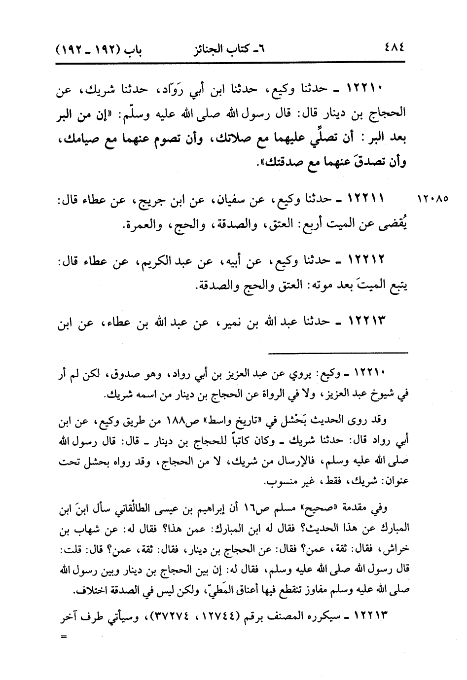 12210- حدَّثَنَا وَكِيعٌ ، حدَّثَنَا ابْنُ رَوَّادٍ ، حدَّثَنَا شَرِيكٌ ، عَنِ الْحَجَّاجِ بْنِ دِينَارٍ ، قَالَ : قَالَ رَسُولُ اللهِ صَلَّى الله عَلَيْهِ وَسَلَّمَ : إنَّ مِنَ الْبِرِّ بَعْدَ الْبِرِّ أَنْ تُصَلِّيَ عَلَيْهِمَا مَعَ صَلاَتِكَ , وَأَنْ تَصُومَ عْنهُمَا مَعَ صِيَامِكَ , وَأَنْ تَصَدَّقَ عَنْهُمَا مَعَ صَدَقَتِك.