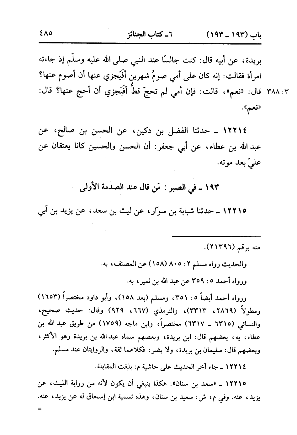 12215- حدَّثَنَا شَبَابَةُ بْنُ سَوَّارٍ ، عَنْ لَيْثِ بْنِ سَعْدٍ ، عَنْ زَيْدِ بْنِ أَبِي حَبِيبٍ ، عَنْ سَعْدِ بْنِ سِنَان ، عَنْ أَنَسٍ ، عَنِ النَّبِيِّ صَلَّى الله عَلَيْهِ وَسَلَّمَ ، قَالَ : الصَّبْرُ فِي الصَّدْمَةِ الأُولَى. (3/388).