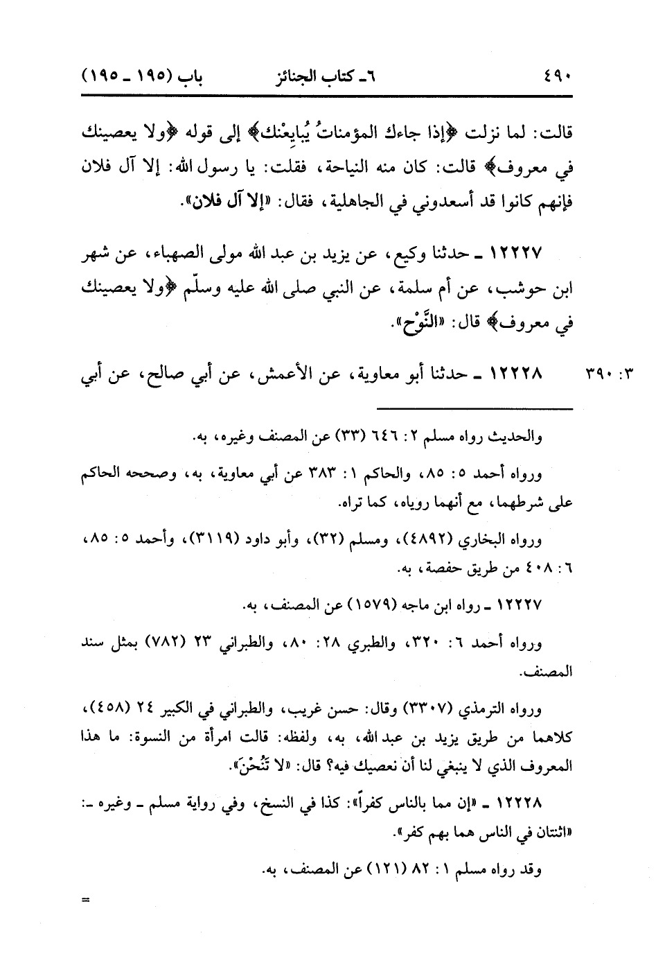 12227- حدَّثَنَا وَكِيعٌ ، عَنْ يَزِيدَ بْنِ عَبْدِ اللهِ - مَوْلَى الصَّهْبَاءِ - عَنْ شَهْرِ بْنِ حَوْشَبٍ ، عَنْ أُمِّ سَلَمَةَ ، عَنِ النَّبِيِّ صَلَّى الله عَلَيْهِ وَسَلَّمَ ، {وَلاَ يَعْصِينَك فِي مَعْرُوفٍ} قَالَ : النَّوْحُ. (3/389).