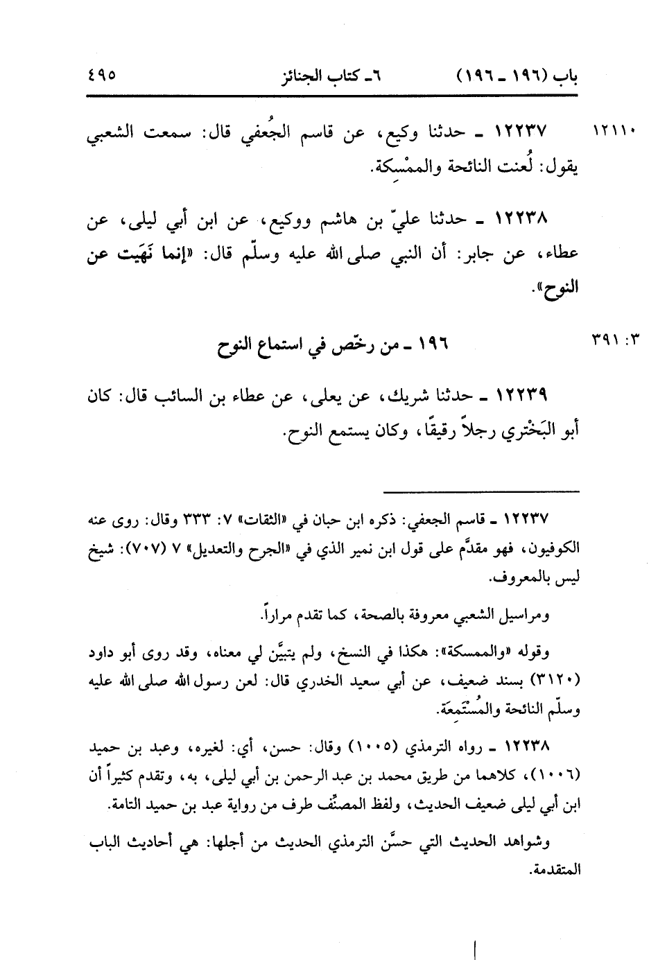 12237- حدَّثَنَا وَكِيعٌ ، عَنْ قَاسِمٍ الْجُعْفِيِّ ، قَالَ : سَمِعْتُ الشَّعْبِيَّ يَقُولُ لُعِنَتِ النَّائِحَةُ وَالْمُمْسِكَةُ.