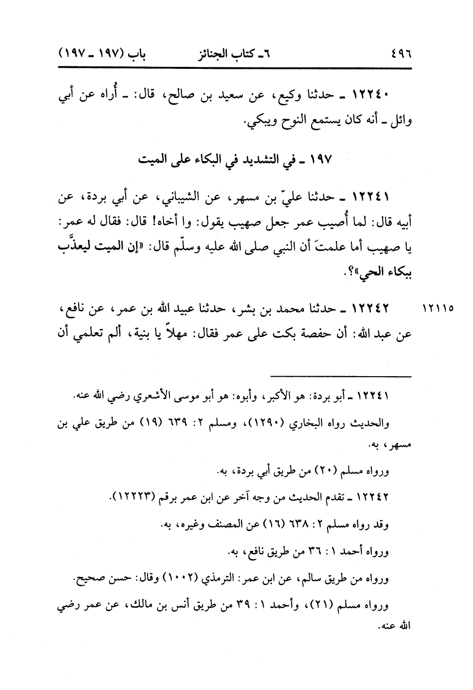 12242- حدَّثَنَا مُحَمَّدُ بْنُ بِشْرٍ ، حدَّثَنَا عُبَيْدِ اللهِ بْنُ عُمَرُ ، عَنْ نَافِعٍ ، عَنْ عَبْدِ اللهِ ، أَنَّ حَفْصَةَ بَكَتْ عَلَى عُمَرَ ، فَقَالَ : مَهْلاً يَا بُنَيَّةَ أَلَمْ تَعْلَمِي أَنَّ النَّبِيَّ صَلَّى الله عَلَيْهِ وَسَلَّمَ ، قَالَ : إنَّ الْمَيِّتَ لَيُعَذَّبُ بِبُكَاءِ أَهْلِهِ عَلَيْهِ. (3/391).