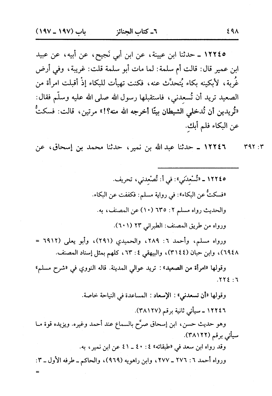 12245- حدَّثَنَا ابْنُ عُيَيْنَةَ ، عَنِ ابْنِ أَبِي نَجِيحٍ ، عَنْ أَبِيهِ ، عَنْ عُبَيْدِ بْنِ عُمَيْرٍ ، قَالَ قَالَتْ أُمُّ سَلَمَةَ لَمَّا مَاتَ أَبُو سَلَمَةَ قُلْتُ غَرِيبة وَفِي أَرْضِ غُرْبَةٍ لأبكينه بُكَاءً يُتَحَدَّثُ عَنْهُ , فَكُنْت تَهَيَّأْت لِلْبُكَاءِ إذْ أَقَبَلَتِ امْرَأَةٌ مِنَ الصعيد تُرِيدُ أَنْ تُسْعِدَنِي فَاسْتَقْبَلَهَا رَسُولُ اللهِ صَلَّى الله عَلَيْهِ وَسَلَّمَ ، فَقَالَ : تُرِيدِينَ أَنْ تُدْخِلِي الشَّيْطَانَ بَيْتًا أَخْرَجَهُ اللَّهُ مِنْهُ مَرَّتَيْنِ قَالَتْ : فَسَكَتُّ عَنِ الْبُكَاءِ فَلَمْ أَبْكِ. (3/391).