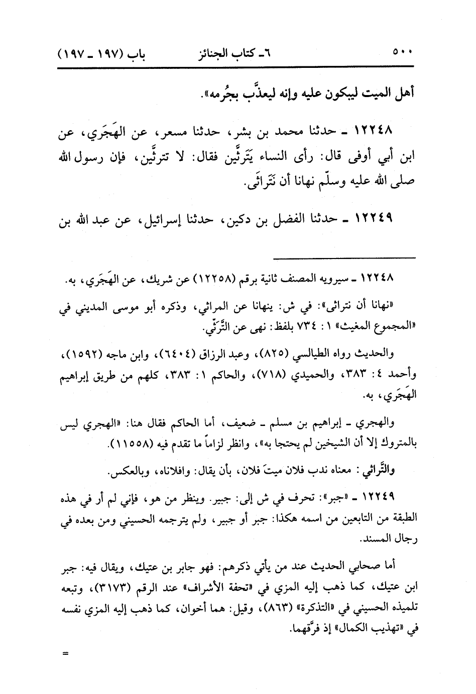 12248- حدَّثَنَا مُحَمَّدُ بْنُ بِشْرٍ ، حدَّثَنَا مِسْعَرٌ ، عَنِ الْهَجَرِيِّ ، عَنِ ابْنِ أَبِي أَوْفَى ، قَالَ : رَأَى النِّسَاءَ يَتَرَثَّيْنَ ، فَقَالَ : لاَ تَتَرَثَّيْنَ فَإِنَّ رَسُولَ اللهِ صَلَّى الله عَلَيْهِ وَسَلَّمَ نْهَانَا ، أَن نَتَرَاثى. (3/392).