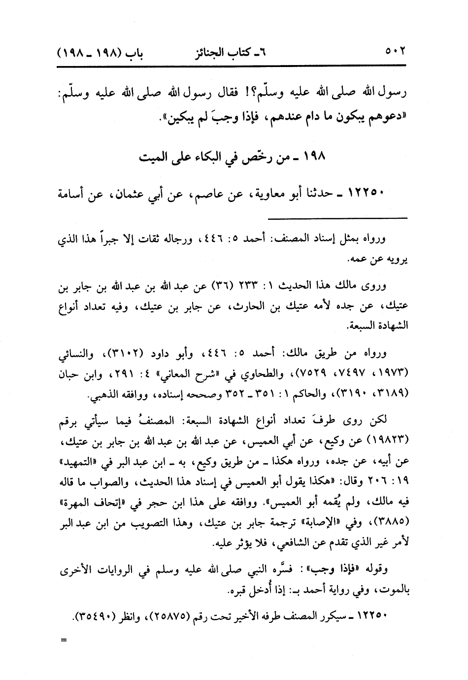 12250- حدَّثَنَا أَبُو مُعَاوِيَةَ ، عَنْ عَاصِمٍ ، عَنْ أَبِي عُثْمَانَ ، عَنْ أُسَامَةَ بْنِ زَيْدٍ ، قَالَ دَمَعَتْ عَيْنُ رَسُولِ اللهِ صَلَّى الله عَلَيْهِ وَسَلَّمَ حِينَ أُتِيَ بِابْنَةِ زَيْنَبَ وَنَفْسُهَا تَقَعْقَعُ : كأَنَّهَا فِي شَنٍّ ، قَالَ فَبَكَى ، قَالَ : فَقَالَ لَهُ : رَجُلٌ تَبْكِي وَقَدْ نَهَيْتَ عَنِ الْبُكَاءِ ، فَقَالَ : إنَّمَا هَذِهِ رَحْمَةٌ جَعَلَهَا اللَّهُ فِي قُلُوبِ عِبَادِهِ وَإِنَّمَا يَرْحَمُ اللَّهُ مِنْ عِبَادِهِ الرُّحَمَاءَ. (3/392).