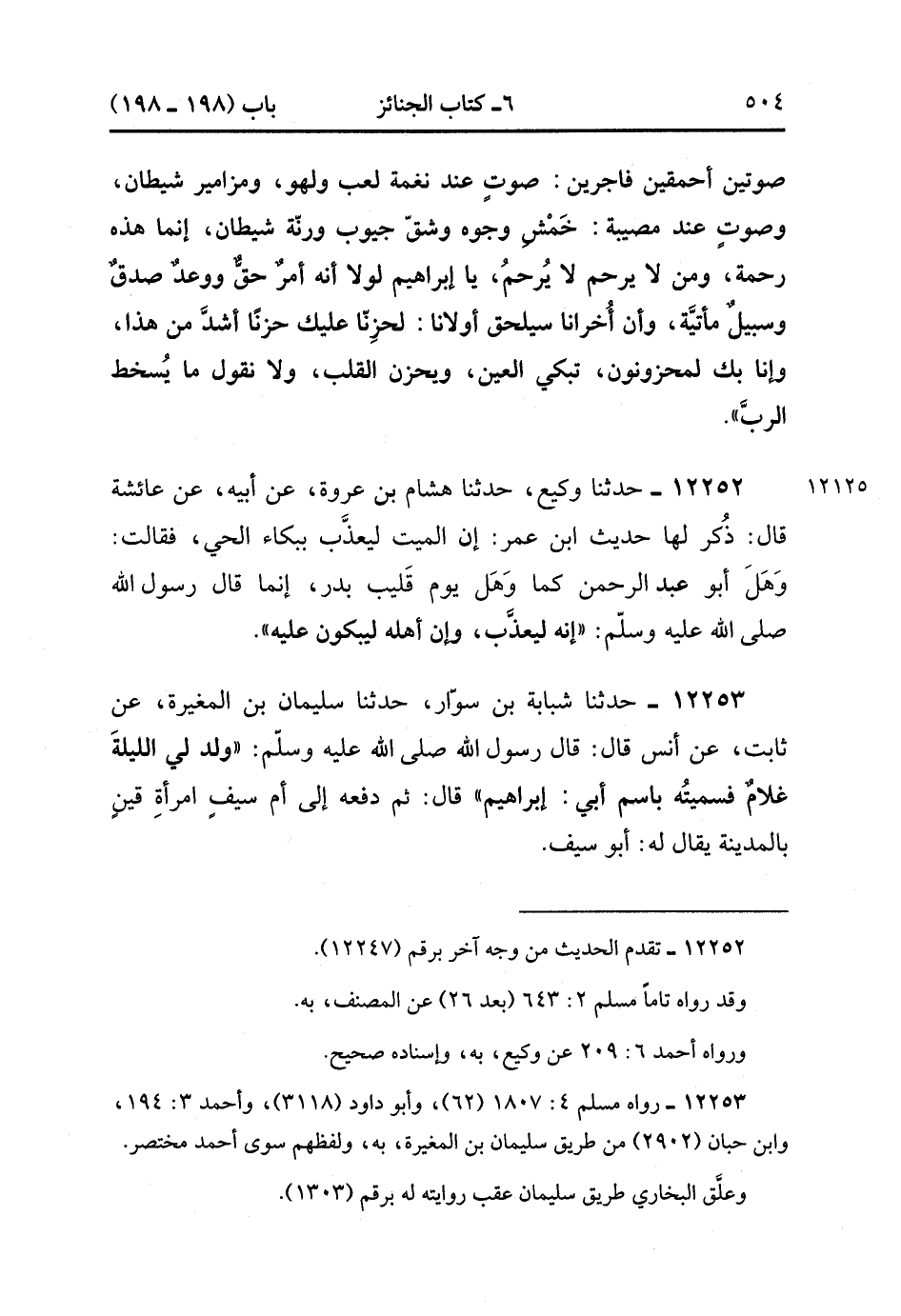 12253- حدَّثَنَا شَبَابَةُ بْنُ سَوَّارٍ ، حدَّثَنَا سُلَيْمَانُ بْنُ الْمُغِيرَةِ ، عَنْ ثَابِتٍ ، عَنْ أَنَسٍ ، قَالَ : قَالَ رَسُولُ اللهِ صَلَّى الله عَلَيْهِ وَسَلَّمَ وُلِدَ لِي اللَّيْلَةَ غُلاَمٌ فَسَمَّيْتُهُ بِاسْمِ أَبِي إبْرَاهِيمَ ، قَالَ : ثُمَّ دَفَعَهُ إلَى أُمِّ سَيْفٍ امْرَأَةِ قَيْنٍ بِالْمَدِينَةِ يُقَالُ لَهُ أَبُو سَيْفٍ , فَانْطَلَقَ رَسُولُ اللهِ صَلَّى الله عَلَيْهِ وَسَلَّمَ وَانْطَلَقْتُ مَعَهُ , فَصَادَفْنَا أَبَا سَيْفٍ يَنْفُخُ فِي كِيرِهِ , وَقَدِ امْتَلأَ الْبَيْتُ دُخَانًا , فَأَسْرَعْت الْمَشْيَ بَيْنَ يَدَيَ النَّبِيِّ صَلَّى الله عَلَيْهِ وَسَلَّمَ حَتَّى انْتَهِيَ إلَى أَبِي سَيْفٍ , فَقُلْت : يَا أَبَا سَيْفٍ أَمْسِكْ أَمْسِكْ جَاءَ رَسُولُ اللهِ صَلَّى الله عَلَيْهِ وَسَلَّمَ , فَأَمْسَكَ , فَدَعَا رَسُولَ اللهِ صَلَّى الله عَلَيْهِ وَسَلَّمَ بِالصَّبِيِّ فَضَمَّهُ إلَيْهِ ، وَقَالَ مَا شَاءَ اللَّهُ أَنْ يَقُولَ ، قَالَ أَنَسٌ : فَلَقَدْ رَأَيْتُهُ يَكِيدُ بِنَفْسِهِ ، قَالَ : فَدَمَعَتْ عَيْنَا النَّبِيِّ صَلَّى الله عَلَيْهِ وَسَلَّمَ ، فَقَالَ رَسُولُ اللهِ صَلَّى الله عَلَيْهِ وَسَلَّمَ : تَدْمَعُ الْعَيْنُ وَيَحْزَنُ الْقَلْبُ ، وَلاَ نَقُولُ إِلاَّ مَا يرضى رَبَّنَا وَإِنَّا بِكَ يَا إبْرَاهِيمَ لَمَحْزُونُونَ. (3/393).