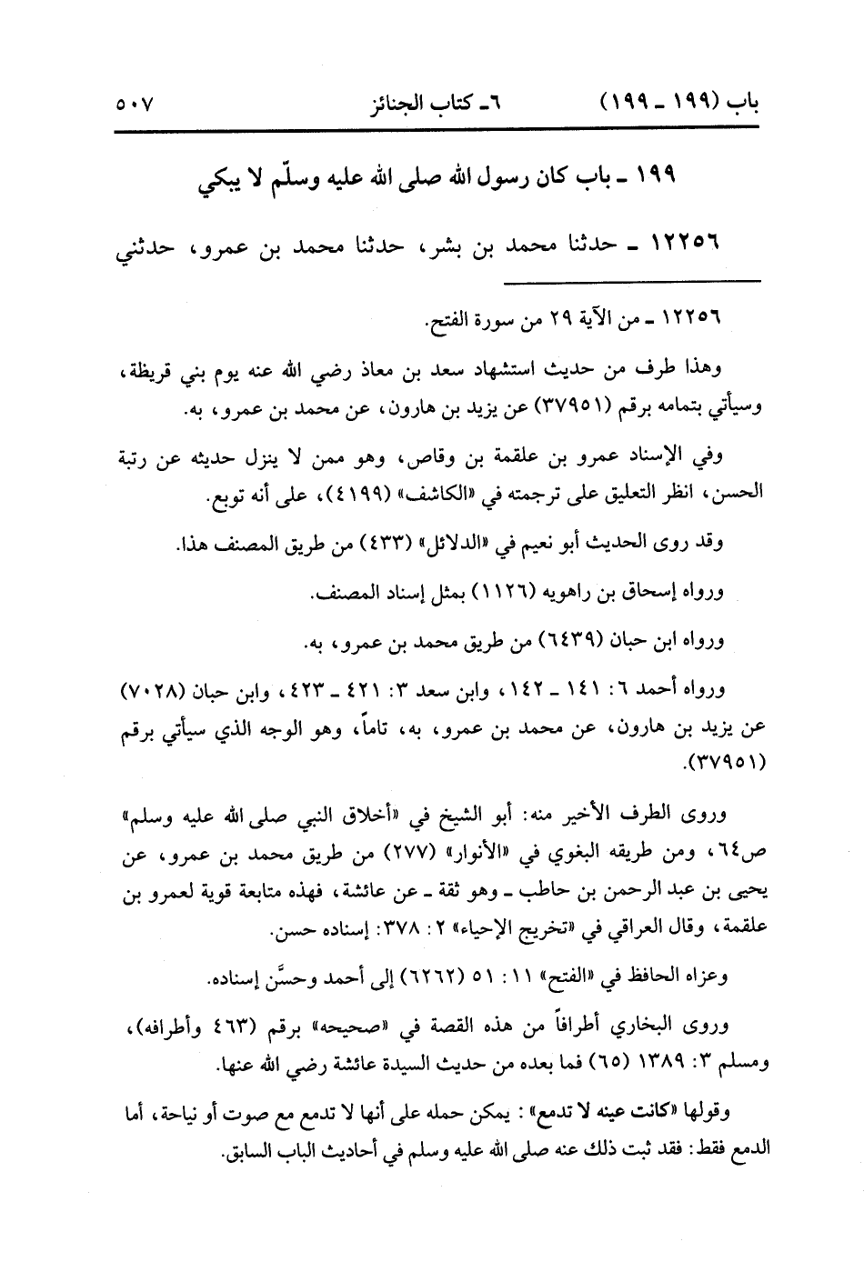 12256- حدَّثَنَا مُحَمَّدُ بْنُ بِشْرٍ ، حدَّثَنَا مُحَمَّدُ بْنُ عَمْرٍو ، حدَّثَنِي أَبِي ، عَنْ عَلْقَمَةَ بْنِ وَقَّاصٍ ، عَنْ عَائِشَةَ أُمِّ الْمُؤْمِنِينَ قَالَتْ : حَضَرَه رَسُولُ اللهِ صَلَّى الله عَلَيْهِ وَسَلَّمَ ، وَأَبُو بَكْرٍ ، وَعُمَرُ يَنْعِي سَعْدَ بْنِ مُعَاذٍ فَوَالَّذِي نَفْسُ مُحَمَّدٍ بِيَدِهِ إنِّي لأَعْرِفُ بُكَاءَ عُمَرَ مِنْ بُكَاءِ أَبِي بَكْرٍ وَإِنِّي لَفِي حُجْرَتِي , قَالَتْ : فَكَانُوا كَمَا قَالَ اللَّهُ {رُحَمَاءُ بَيْنَهُمْ} ، قَالَ عَلْقَمَةُ : أَيْ أُمَّاهُ كَيْفَ كَانَ يَصْنَعُ رَسُولُ اللهِ صَلَّى الله عَلَيْهِ وَسَلَّمَ ، قَالَ : كَانَتْ عَيْنُهُ لاَ تَدْمَعُ عَلَى أَحَدٍ وَلَكِنَّهُ كَانَ إذَا وَجَدَ فَإِنَّمَا هُوَ آخِذٌ بِلِحْيَتِهِ. (3/394).