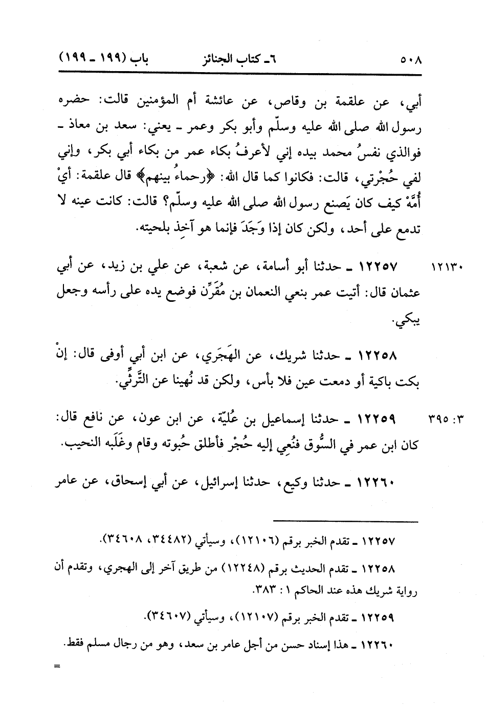 12260- حدَّثَنَا وَكِيعٌ ، حدَّثَنَا إسْرَائِيلُ ، عَنْ أبي إِسْحَاقَ ، عَنْ عَامِرِ بْنِ سَعْدٍ الْبَجَلِيِّ ، عَنْ أَبِي مَسْعُودٍ وَثَابِتِ بْنِ يَزِيدٍ وَقَرَظَةَ بْنِ كَعْبٍ قَالُوا : رُخِّصَ لَنَا فِي الْبُكَاءِ عَلَى الْمَيِّتِ فِي غَيْرِ نَوْحٍ. (3/395).