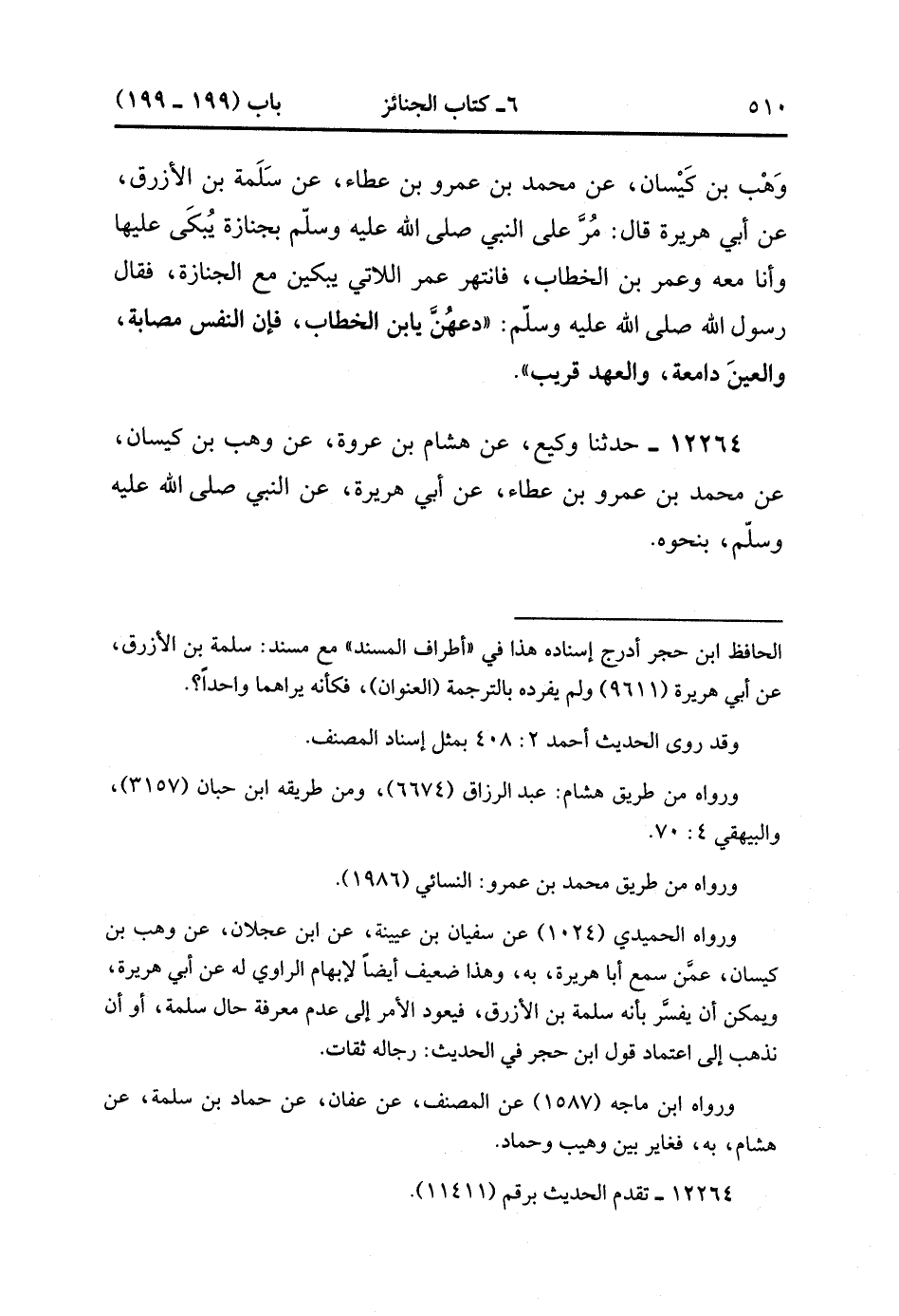 12263- حدَّثَنَا عَفَّانَ ، حدَّثَنَا وُهَيْبٌ ، عَنْ هِشَامٍ بْنِ عُرْوَةَ ، عَنْ وَهْبِ بْنِ كَيْسَانَ ، عَنْ مُحَمَّدِ بْنِ عَمْرِو بْنِ عَطَاءٍ ، عَنْ سَلَمَةَ بْنِ الأَزْرَقِ ، عَنْ أَبِي هُرَيْرَةَ ، قَالَ : مُرَّ عَلَى النَّبِيِّ صَلَّى الله عَلَيْهِ وَسَلَّمَ بِجِنَازَةٍ يُبْكَى عَلَيْهَا وَأَنَا مَعَهُ ، وَعُمَرُ بْنُ الْخَطَّابِ فَانْتَهَرَ عُمَرُ اللاَتِي يَبْكِينَ مَعَ الْجِنَازَةِ ، فَقَالَ رَسُولُ اللهِ صَلَّى الله عَلَيْهِ وَسَلَّمَ : دَعْهُنَّ يَا ابْنَ الْخَطَّابِ فَإِنَّ النَّفْسَ مُصَابَةٌ وَالْعَيْنَ دَامِعَةٌ وَالْعَهْدَ قَرِيبٌ.