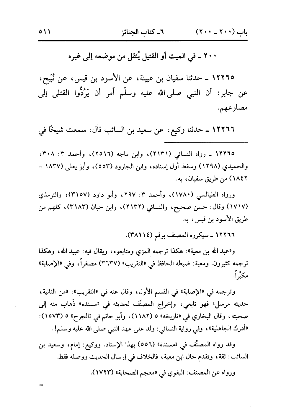 12265- حدَّثَنَا سُفْيَانُ بْنُ عُيَيْنَةَ ، عَنِ الأَسْوَد بْنِ قَيْسٍ ، عَنْ نُبَيْحٍ ، عَنْ جَابِرٍ ، أَنَّ النَّبِيَّ صَلَّى الله عَلَيْهِ وَسَلَّمَ أَمَرَ أَنْ يَرُدوا الْقَتْلَى إلَى مَصَارِعِهِمْ.
