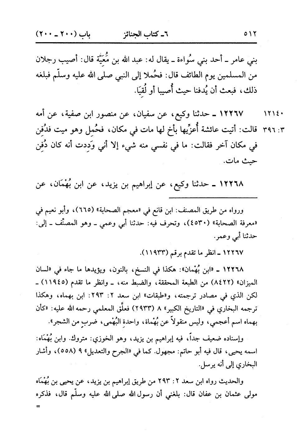 12268- حدَّثَنَا وَكِيعٌ ، عَنْ إبْرَاهِيمَ بْنِ يَزِيدَ ، عَنِ ابْنِ بُهْمَانَ ، عَنْ جَابِرِ بْنِ عَبْدِ اللهِ ، قَالَ : قَالَ النَّبِيُّ صَلَّى الله عَلَيْهِ وَسَلَّمَ : تُدْفَنُ الأَجْسَادُ حَيْثُ تُقْبَضُ الأَرْوَاحُ. (3/396).